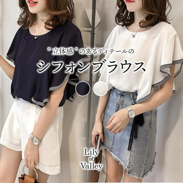 送料無料&即納★ ストライプ フリルスリーブ シフォン ブラウス 半袖 きれいめ カジュアル フレア 上品 / レディース トップス シアー シースルー シャツ フリル 袖コンシャス オフィス 無地 清楚 ふんわり 襟なし お呼ばれ 事務服 ゆったり 夏 春 紺 白 ホワイト ネイビー