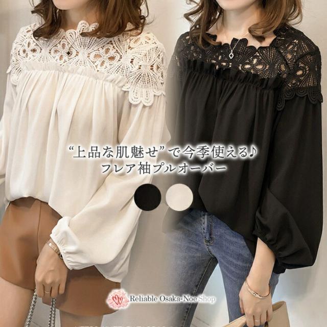 店内SALE!! オフィスカジュアル かぎ編み フレア袖 プルオーバー 大人可愛い 花柄 レース 刺繍 カットソー シャツ ブラウス 長袖 白 黒 / ボリューム袖 フレア ふんわり 袖 スリーブ レディース トップス レースブラウス 大きいサイズ 夏 春 秋 冬 ホワイト ブラック