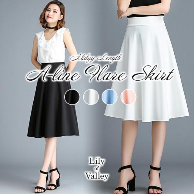 店内SALE!! ミディ丈 Aライン フレア スカート 上品 大人可愛い ふんわり 膝下 ひざ下 ハイウエスト / フレアスカート Aラインスカート プリーツ 無地 ひざ丈 膝丈 ミモレ丈 ウエストゴム 清楚 大きいサイズ 春 夏 秋 冬 黒 ブラック 白 ホワイト ピンク 青 ブルー