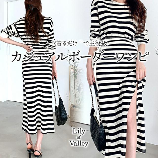 送料無料&即納★ カジュアル ボーダー プルオーバー ワンピース きれいめ 長袖 上品 柄 清楚 スリット / レディース マーメイド フレア ロング丈 ミモレ 韓国 オフィスカジュアル ラップ ボリューム袖 ボリュームスリーブ ウエストリボン 白 ホワイト 黒 ブラック 秋冬 春