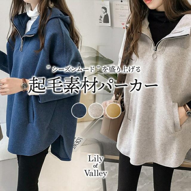 シーズンムードを盛り上げるあったか起毛素材♪フロント ファスナー ボーイフレンド パーカー/アウター ボリュームスリーブ ゆったり スウェット 秋 冬 春 オーバーサイズ 大きい