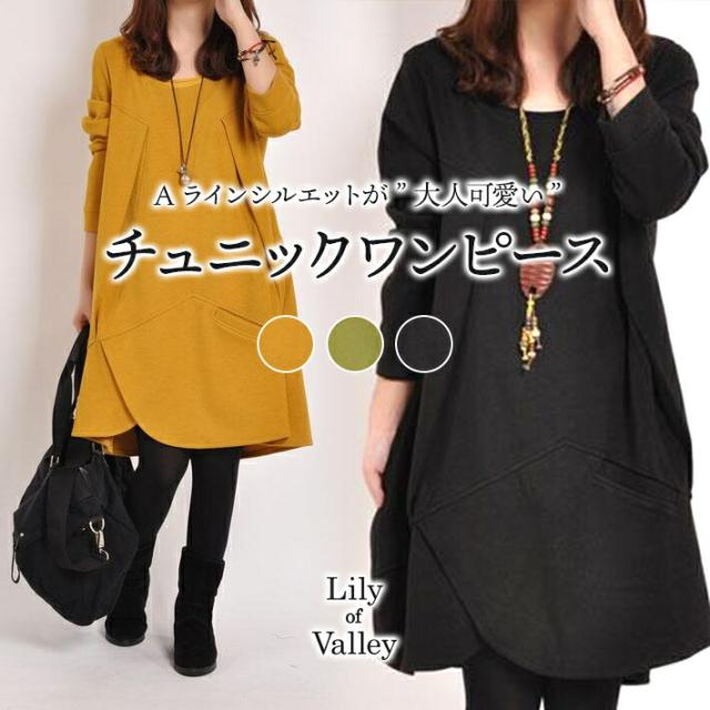 店内SALE!! 森ガール チュニック ワンピース 秋冬 ひざ上 膝上 長袖 Aライン / 黒 ブラック 黄 イエロー 緑 グリーン 大人可愛い 上品 清楚 カジュアル レトロ 大きいサイズ 体型カバー ゆったり ふんわり ひざ丈 レディース チュニックワンピース 無地 綿 春 秋 冬