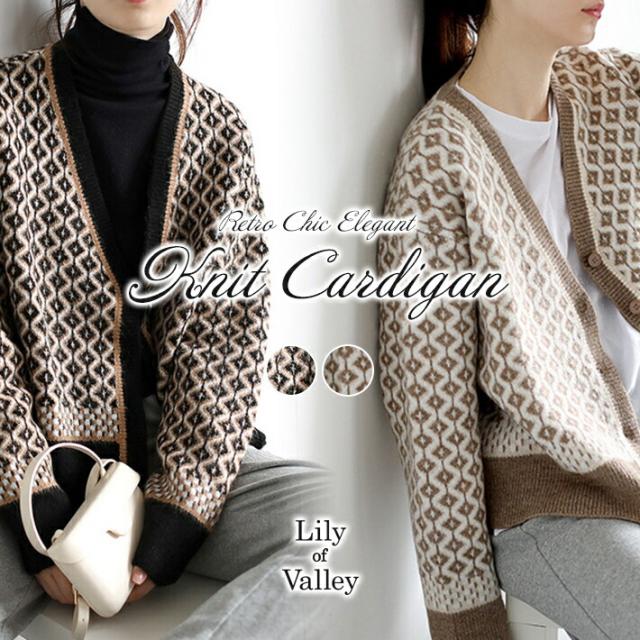 ・シックなレトロ柄が今っぽい♪レトロ柄ショート丈ざっくりニットカーディガン。