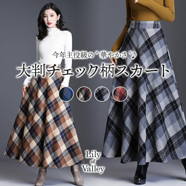 送料無料&即納★ フェイクウール ミモレ丈 大判 チェック柄 ロング スカート ボトムス きれいめ 暖か 上品 / レディース ミモレ丈スカート フレアスカート Aラインスカート ハイウエスト ロング丈 秋 冬 秋冬 チェック 緑 赤 茶色 青 グレー カーキ ワイン ブラウン ブルー