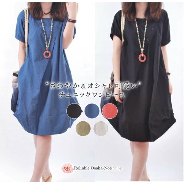店内SALE!! ワンピース オーガニック デザイン さらさら 綿 コットン 夏 半袖 チュニックワンピース シャツワンピ シャツワンピース カットソー ひざ丈 膝丈 ロング レトロ 森ガール 韓国 無地 大きいサイズ 春 春夏 黒 ブラック 赤 レッド 青 ブルー 緑 グリーン