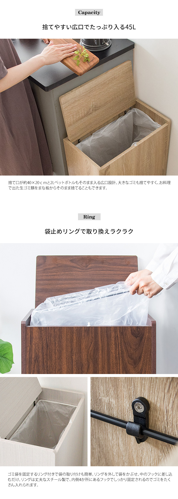 ゴミ箱だと分かりにくいスタイリッシュなデザインでキッチンに馴染みます。 たっぷり入る45Lで、ニオイ漏れを防ぐフタや移動がラクにできる隠しキャスター付きで利便性も抜群。