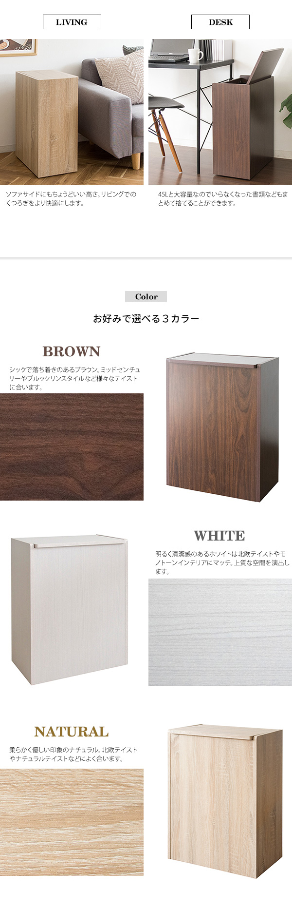 お部屋に馴染みやすいブラウンとホワイト、ナチュラルの3カラーをご用意。お好みでお選びください。