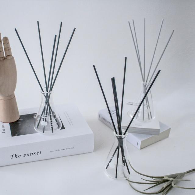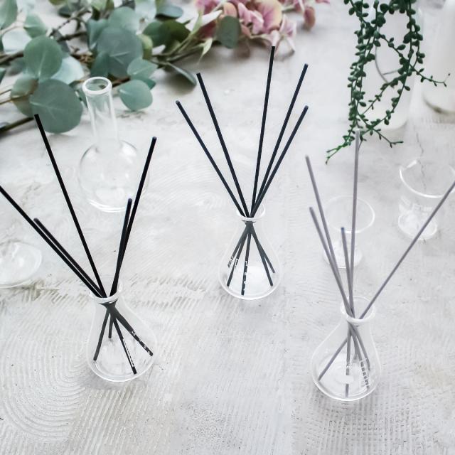 インダストリアル系インテリアで人気の実験器具を、そのままリードディフューザーの容器にしました。シンプルなインテリアにも溶け込むスッキリとしたデザインで、女性だけでなく男性にも使いやすいユニセックスなディフューザーです。