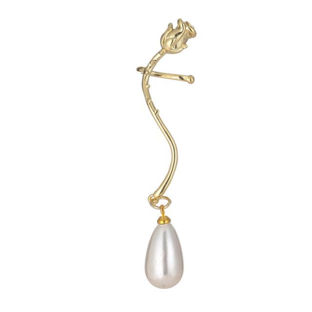 バラの花一輪のモチーフにティアードロップ型のイミテーションの真珠チャームが揺れるイヤラップピアス。