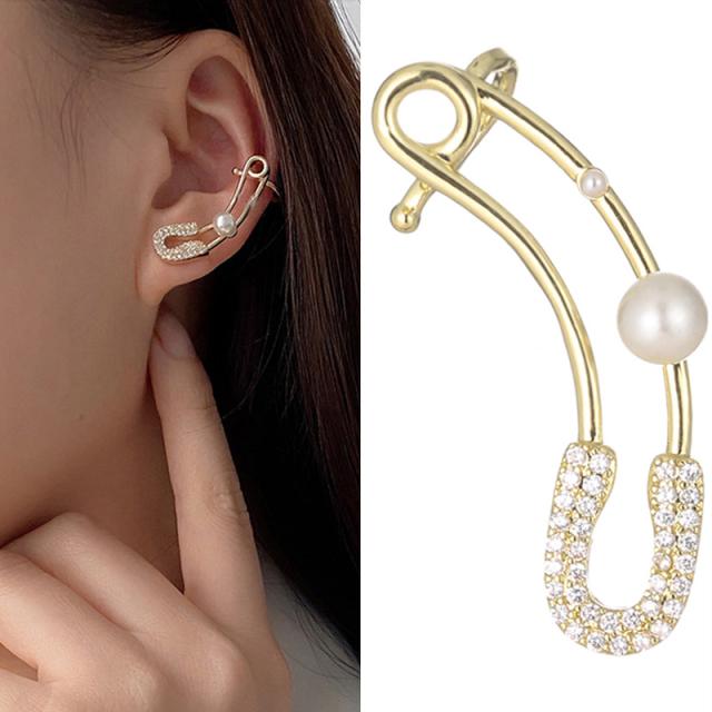 ゴールドパベセーフティーピンパール イヤーカフピアス 1個 左耳用 安全ピン 真珠 石付きイヤーラップピアス 耳 イヤーフックピアス メンズ レディース キラキラ パヴェ 金色 ゴールド クリスタル ラインストーン ジルコニア 結婚式 パーティー 入学式 20G 20ゲージ 男 女