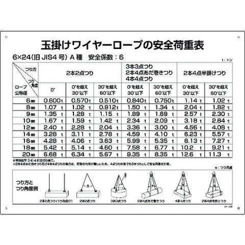 緑十字 クレーン関係標識 玉掛ワイヤーロープノ安全荷重表 KY-200 450×600mm 塩ビ 84200(代引不可)