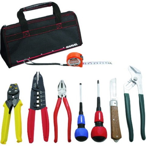 ●圧着工具(リングスリーブ中小用):MH-7S●VA線ストリッパー(四サイズ対応、三芯同時ストリップ):MVA-1620●プラスドライバー:+2×100●マイナスドライバー:-5.5×100●ウォーターポンププライヤー:MWP-250●ペンチ:MC-1050-175●電工ナイフ:MEK-70●メジャー:13mm幅×2m●ファスナー付きバッグ