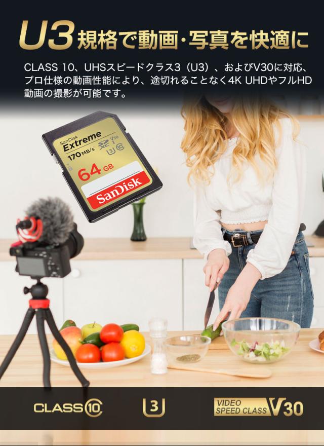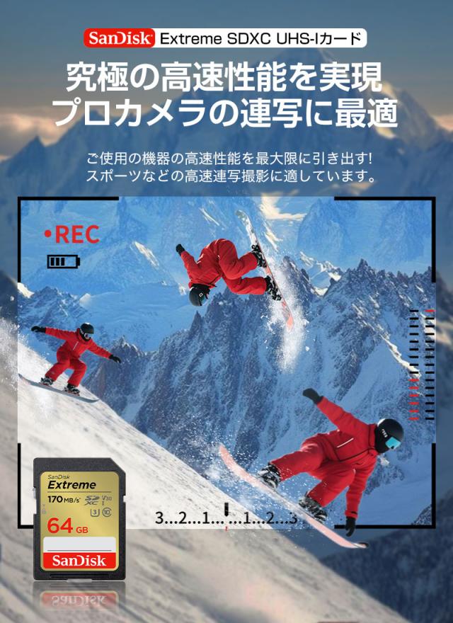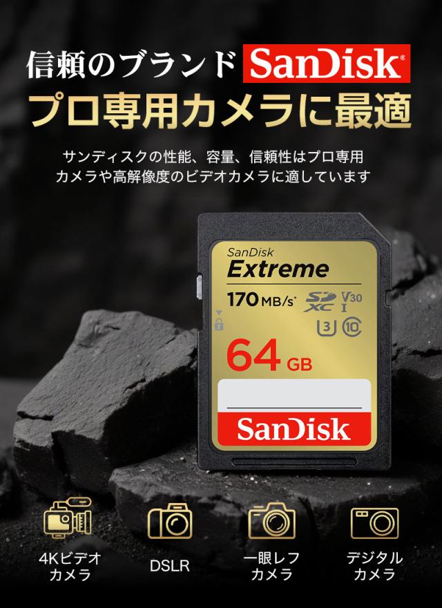 SanDisk SDカード SDXCカードサンディスク Extreme 64GB UHS-I U3 V30 4K R:170MB/s W:80MB/s 4K Ultra HD対応SDSDXV2-064G-GNCIN 海外パッケージ 送料無料 ポイント消化
