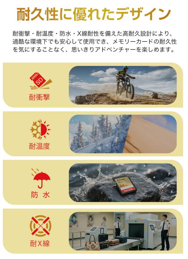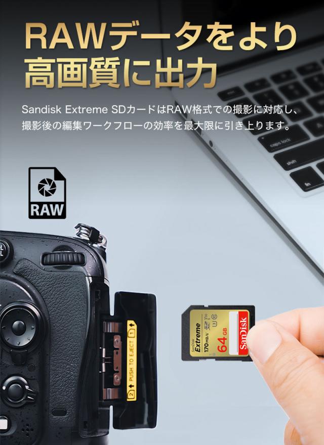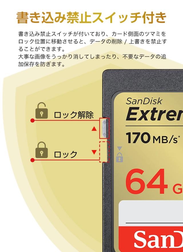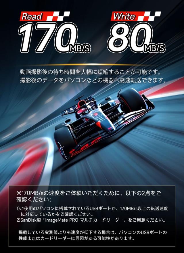 ※170MB/sの速度を体験するため、以下の2点をご確認ください:1)ご利用のパソコンに搭載したUSBポートの速度が170MB/S以上のものかどうかは予めご調査ください。2)SandiskのSDDR-C531カードリーダーをご用意ください。※現時点(2019/06)に170MB/秒を達したUHS-1カードリーダーは【SandiskのSDDR-C531】のみです。 掲載した速度実測値より低下の場合、パソコンUSBポート性能かカードリーダーか問題が示唆されます。 大容量フラッシュメモリーの取扱いについて:SDXCカードをSDXC規格非対応製品に差し込むと、SDXCカード内のデータが破損されます。また、その際に、SDHC規格でフォーマットし、認識する場合がございますが、この操作に関わらずにSDXCカード内のデータが破損されます。絶対に差し込まないでください。