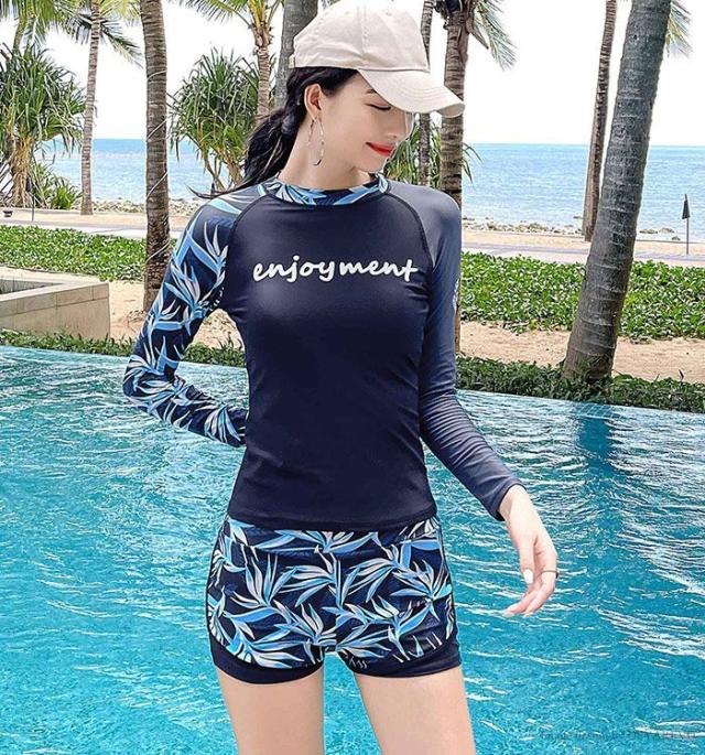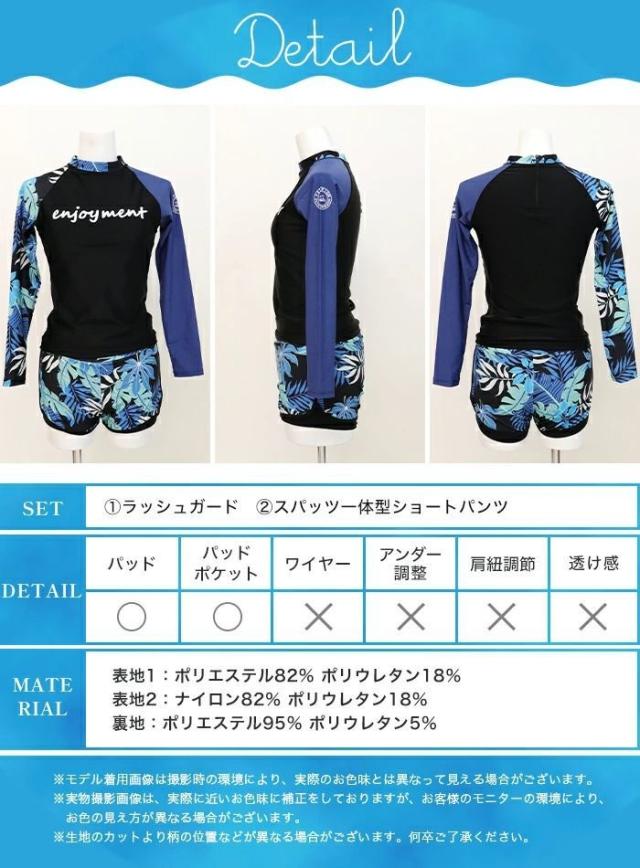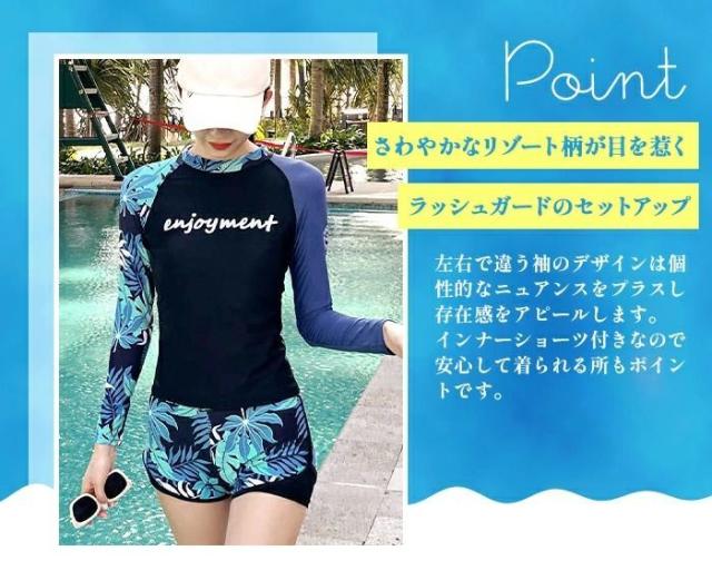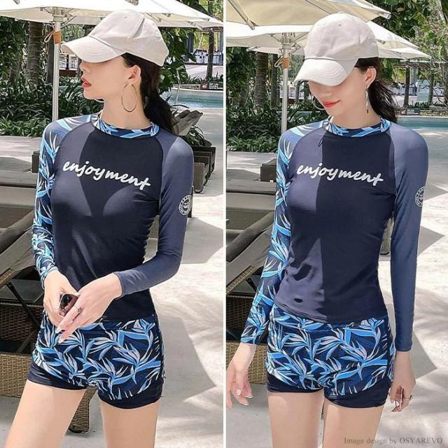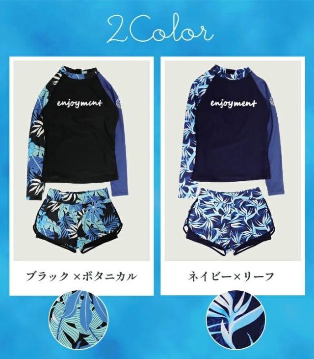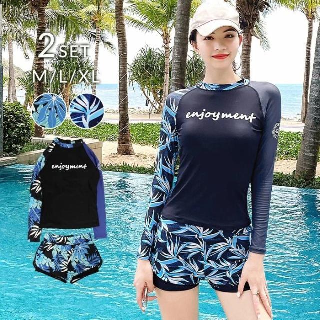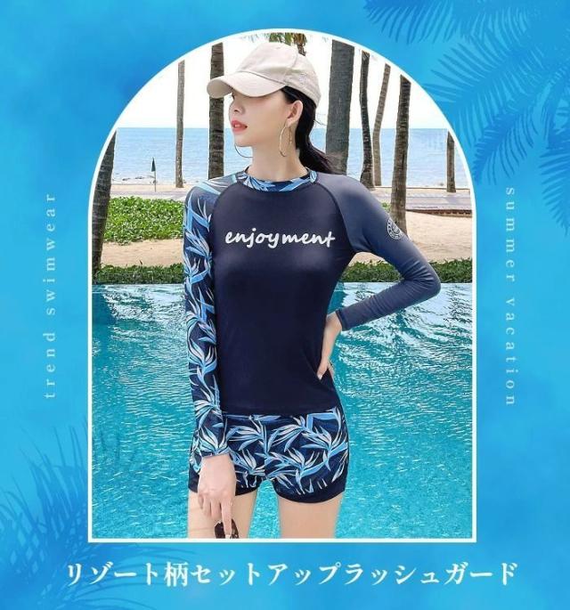 水着 レディース フィットネス 体型カバー フィットネス水着 セパレート ラッシュガード 長袖 ショートパンツ 上下セット ボタニカル柄 リーフ柄 ブラック ネイビー 露出控えめ ママ ミセス おしゃれ マリンスポーツ ジム