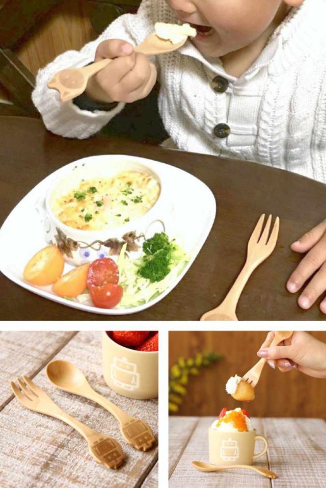 ご飯の時間がより楽しくなるお子様用の木製フォークとスプーンのセットです。大好きなアニマルや乗り物などの楽しいデザインできっとお気に入りが見つかるはずです。