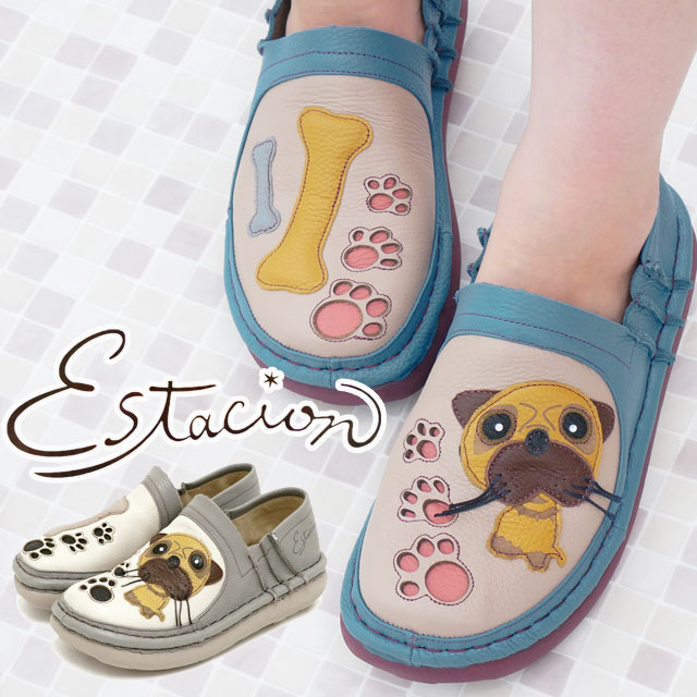 送料無料 レディース SS 春夏 新作 2022 春新作 夏新作 スリッポン ローカット 人気 流行 定番 Estacion TG158 犬モチーフ コンフォートシューズ カジュアルシューズ パグ ワンちゃん ワンコ イヌ 本革 靴 ブルー/ベージュ グレー/アイボリー