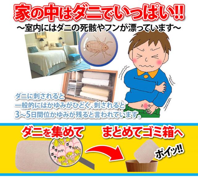 | 使用場所 | ダニは湿気のあるところやお菓子の食べこぼしのふるところ、暗く温暖な所に居ますので、パッケージのイラストなどを参考にシートを置いてください。 |