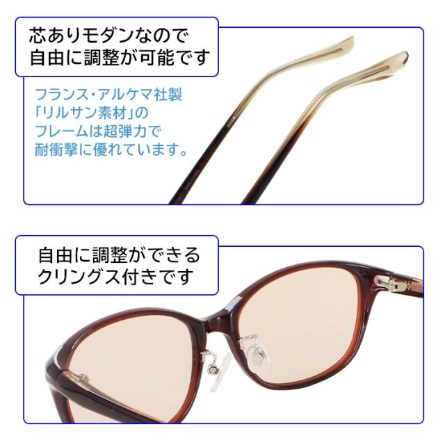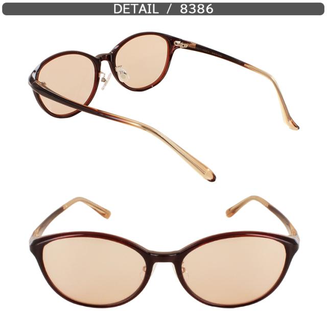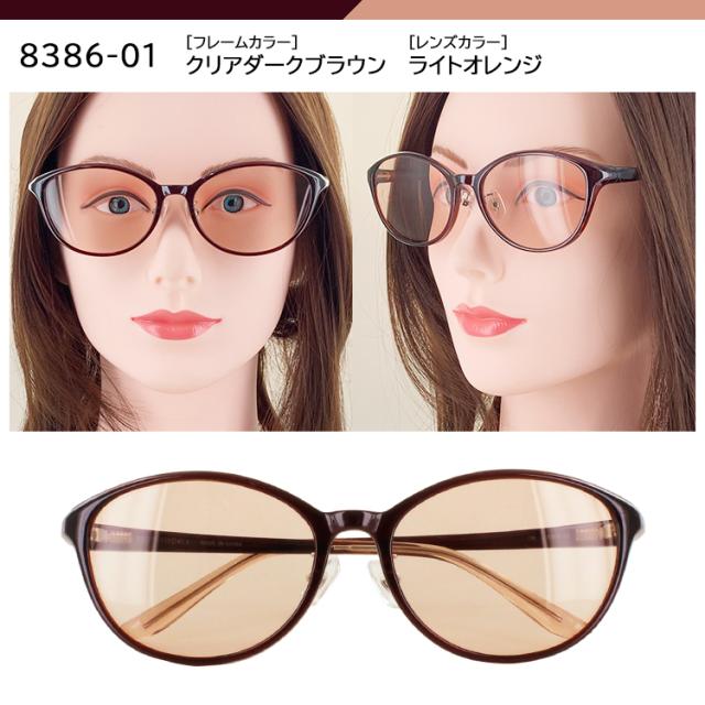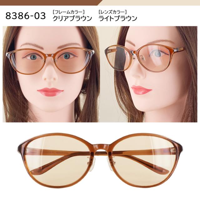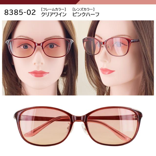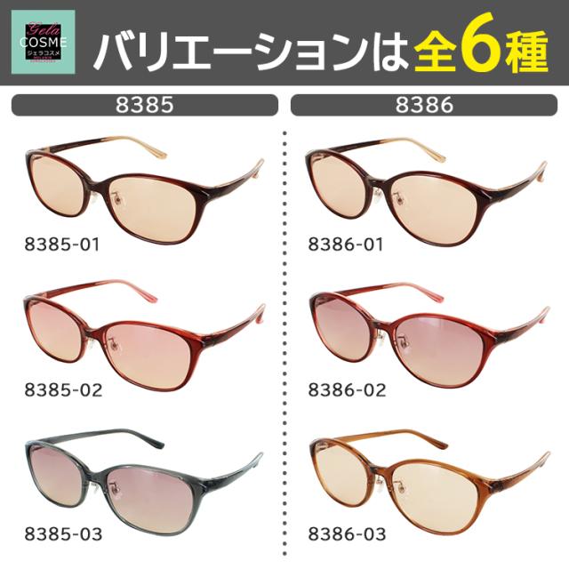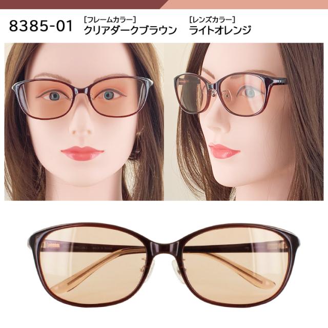 | 8385-01 クリアダークブラウン/ライトオレンジ 8385-02 クリアワイン/ピンクハーフ 8385-03 クリアグレー/スモークハーフ 8386-01 クリアダークブラウン/ライトオレンジ 8386-02 クリアワイン/スモークハーフ 8386-03 クリアブラウン/ライトブラウン | ●素材 フレーム:プラスチック テンプル:プラスチック レンズ:プラスチック ●可視光線透過率 8385-01:60% 8385-02:60% 8385-03:50% 8386-01:60% 8386-02:50% 8386-03:60% ●特徴 メラニンレンズ ブルーライトカット 約40%以上&UVカット 99% |