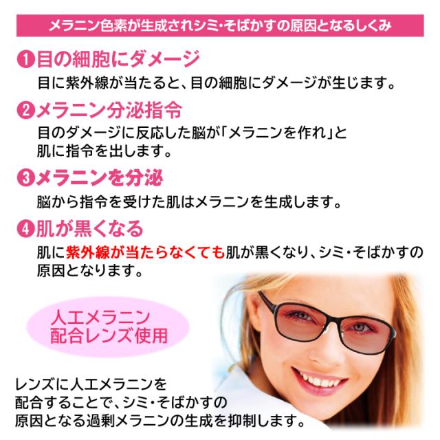 | 商品詳細 サングラス レディース メラニンサングラス ジェラ コスメ 8385 8386 新常識!人口メラニンで目からUV対策。 メラニンレンズは特殊製法で人工メラニンを配合し、シミやそばかすの原因となる 過剰メラニンの生成を抑制するレンズです。 ブルーライトもカットするので、物が見やすく目が疲れにくくなります。 紫外線 約99%カット!ブルーライト約40%カット! ライフスタイルに合わせた有害光線対策に! 通勤時やドライブ、車の運転、日中の外出に、アウトドア、スポーツに、またPCやスマホを操作する時など、様々なシーンで活躍します。 クリングス鼻パッド採用で、自在に調整可能! 芯入りモダンで簡単にフィッティング調整が可能です。 テンプル(腕)の部分は超弾力で耐衝撃にすぐれた素材を使用しています。 | |