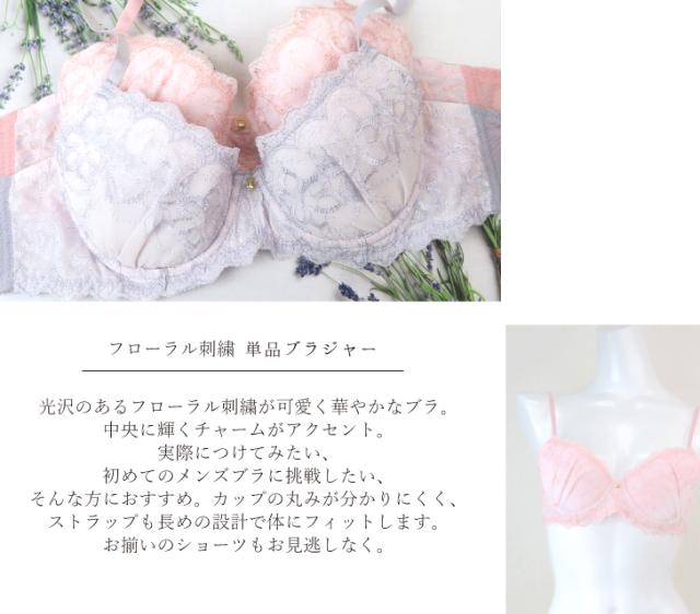 光沢のあるフローラル刺繍が可愛く華やかなブラ。中央に輝くチャームがアクセント。実際につけてみたい、初めてのメンズブラに挑戦したい、そんな方におすすめ。カップの丸みが分かりにくく、ストラップも長めの設計で体にフィットします。お揃いのショーツもお見逃しなく。