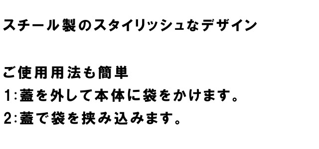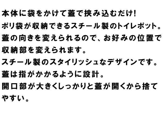 本体に袋をかけて蓋で挟み込むだけ! ポリ袋が収納できるスチール製のトイレポット。
