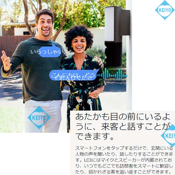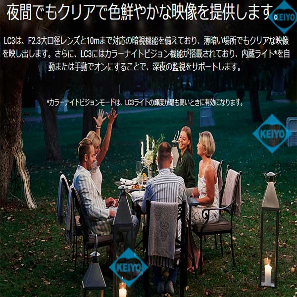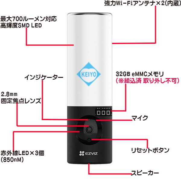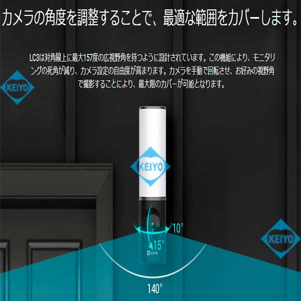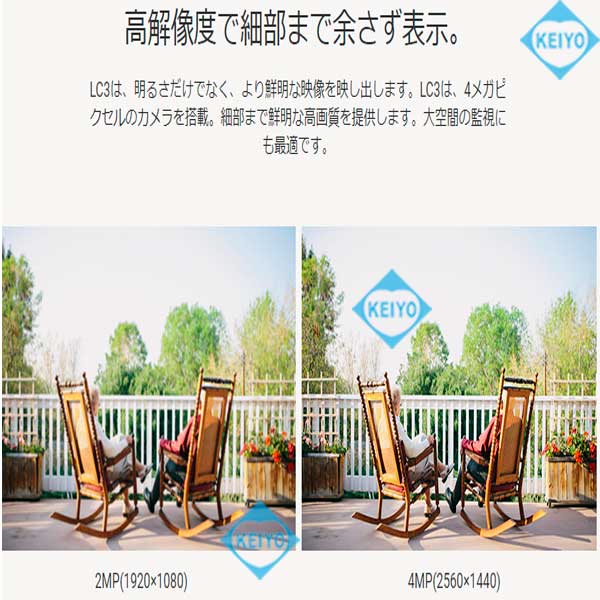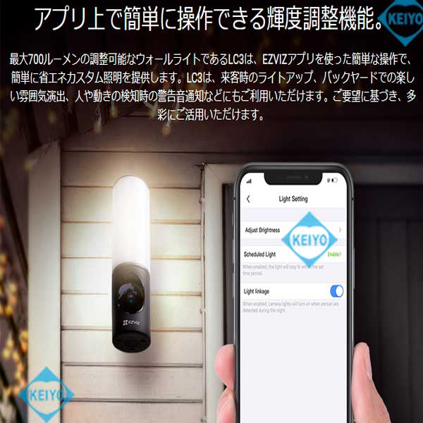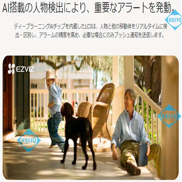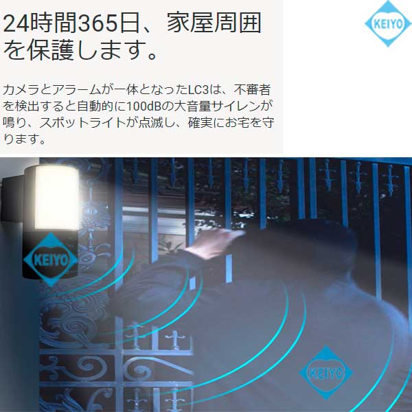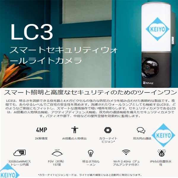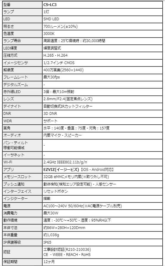 ![]() CS-LC3は、H.265方式を採用した屋外設置対応 32GB eMMCメモリ内蔵ウォールライト機能付 400万画素Wi-Fiネットワークカメラです。 世界第1位の防犯カメラメーカー Hikvision (ハイクビジョン)社グループのコンシューマ向けブランド EZVIZ(イージービズ)ブランドの製品となっております。 ●アプリから簡単に操作可能な輝度調整機能 CS-LC3は、最大700ルーメンの調整可能な ウォールライト機能を有しています。 来客時に足元を照らしたり、庭先でのバーベキュー時の雰囲気演出 人や動きを検知した際の警告音通知等にもご利用いただけます。 ●広角撮影に対応する固定焦点レンズ採用 搭載するレンズは、明るい固定焦点レンズを搭載しています。 対角157度の広角仕様となっておりますので ご自宅の玄関・マンションの入り口等への設置に 最適な製品となっております。 ●最適な範囲を撮影できるカメラ角度調整機構 CS-LC3は、対角157度のワイドアングルを最大限発揮できるように カメラを手動で回転させてお好みの視野角に調整可能です。 上下15度・左右10度の範囲で、アングル調整に対応しております。 ●屋外設置を可能にしたIP65構造 CS-LC3は、屋内入り口等への設置はもちろんのこと屋外設置にも対応。 ご自宅の駐車場監視、自宅敷地内へ立ち入る人の録画等にも ご活用いただけます。 ●双方向通話に対応するマイク・スピーカー内蔵モデル CS-LC3は、本体前面に集音マイク・底面にスピーカーを搭載。 ライブ映像確認時の音声マイクとしても、録画データ保存時にも 映像と音声を一緒に記録する事が可能です。 (※マイク機能は、オフにして利用する事も可能) スピーカーも搭載しておりますので、家族と会話を行ったり 不審者に対して、警告を行う事もできます。 ●大音量サイレンによる警告機能 CS-LC3は、不審者を検出すると自動的に100dBの 大音量サイレンが鳴り、スポットライトを点滅させて 侵入者が、敷地内に立ち入ることを警告します。 ●人物・車両の動きに応じた録画をするAIディープラーニング機能 CS-LC3は、組み込み済のディープラーニングモデルにより リアルタイムで人・車両の形をした動きを検知します。 そのため、検知エリア内に人・車両が侵入すると精度の高い 検出を行い、必要な場合のみプッシュ通知を行います。 ●2Kハイビジョンサイズ動画・静止画撮影対応 動画・静止画共に2560×1440(1440p)の録画・撮影が可能。 動画撮影時は、音声記録にも対応します。 ●32GB eMMCメモリ内蔵 CS-LC3は、32GBのeMMCメモリを内蔵しておりますので 別途、録画用カードを用意する必要はございません。 動画・静止画は、内蔵のメモリに記録ができます。 メモリ内に記録された動画・静止画データは、スマホで接続して アプリ側に保存することも可能です。 ●クラウドストレージ対応(有料) メモリーカード録画以外に、有料のクラウドストレージを使用した 録画にも対応しております。(EZVIZクラウド) ご希望の方は、アプリ内のクラウドストレージ ご契約画面より、ご希望のプランをお選びいただきご契約ください。 ●わかりやすい日本語化アプリ 使用するアプリ、【EZVIZ(イージービズ)】は 日本語化されており、わかりやすいデザインです。 はじめての方にも、やさしい画面となっております。 ●赤外線LED3個搭載 最大照射距離10Mに対応した、可視光タイプ赤外線LED3個搭載。 明るい時はカラー映像、暗くなったらLED光を照射して 高感度モノクロ映像で撮影します。 ●夜間のカラー撮影に対応するカラーナイトビジョン機能 CS-LC3は、F2.3の大口径レンズを搭載しておりますので 薄暗い場所でも、従来機種に比べてクリアに映像を映し出します。 搭載されているカラーナイトビジョン機能は、内蔵されているライトを 手動または、自動オンすることで深夜の監視にも対応します。 (※カラーナイトビジョンモードは、ライトの輝度が 最も高い時にのみ有効) ●見やすいインジケーターランプ搭載 本体前面に、各種動作が確認できるインジケーターを搭載しています。 ●動きがあった時だけ録画する、動体検知機能 カメラが動きを検知すると、スマホにプッシュ通知します。 (オン/オフ設定可) 画面上に動きの無いときは録画を行わないため、メモリの節約ができる他 反応があった際は、アプリのアラート画面から異変のあった時点の 動画を、ピンポイントで再生できます。 ●複数台のスマホからライブ映像を見る、シェア機能 カメラ設定を行ったスマートフォンから、別のスマホからライブ映像に 接続する事を許可(シェア)する事ができます。 ●ライブ映像・録画データアクセス時用パスワード設定対応 EZVIZシリーズのカメラは、ライブ映像・録画データアクセス時用に パスワードを設ける事ができます。 第三者がスマホに触れて、不正に映像を閲覧しようとしても 上記機能により、セキュリティレベルを上げることにより セキュアなネットワークシステムを構築できます。 ●離れた場所からでも映像が見れるWi-Fi機