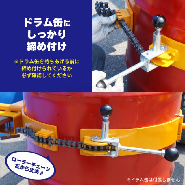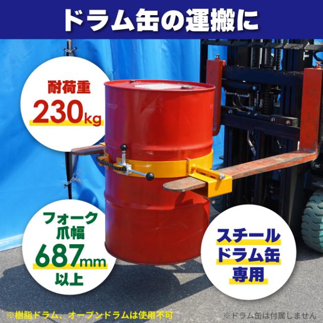 ドラム缶の運搬、傾け、回転に ●乗用フォークリフトに簡単に取り付け、ドラム缶の持ち運び、傾けが可能 ●200L(50ガロン)のスチールドラム缶に使用可能です ※樹脂ドラム、オープンドラムは使用不可 ●ドラム缶への装着は、乗用フォークリフトの爪に固定し、上から嵌めるだけ ●固定ハンドルの操作でドラム缶を素早く締め付けてしっかりと固定します ●軸を中心に回転するので自由な角度で傾けることが可能 ●輪を折り畳んで、コンパクトに収納出来ます ※フォークリフト/製品のサイズを必ずご確認ください ※ドラム缶を傾ける際は危険ですので、必ず両手で固定し、横または後ろから 傾けてください ※比重の重たい材料(鉄スクラップ等)が入ったドラム缶は使用しないでください ※内容量が半分以下の場合、2人での作業を推奨します ※周囲の状況に充分注意して安全に作業をして下さい ※取扱説明書は商品に同封しておりません 当ページのQRコードをかざして読み取ってください 品番:DHR-26 |