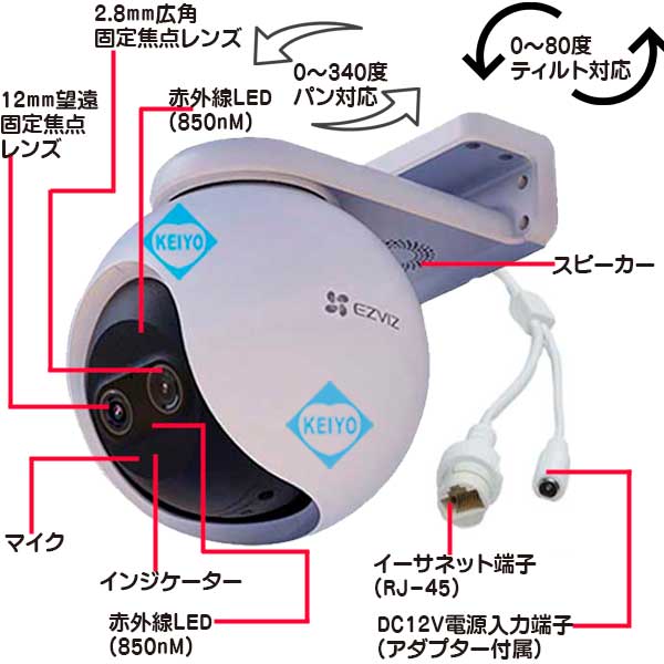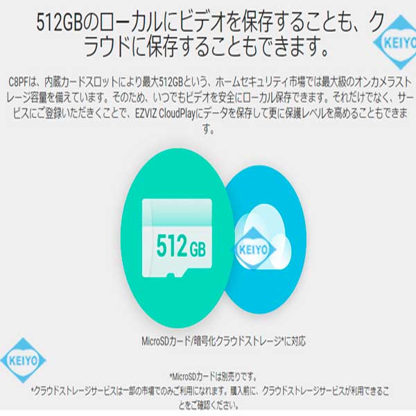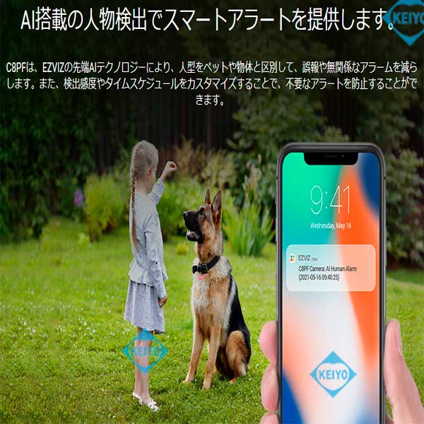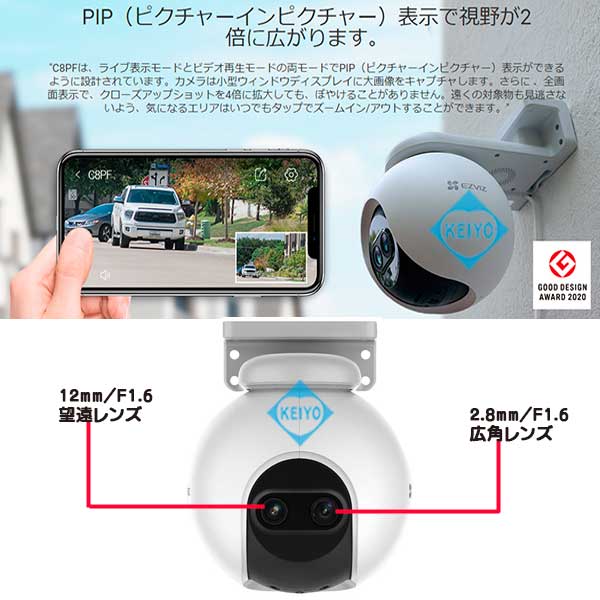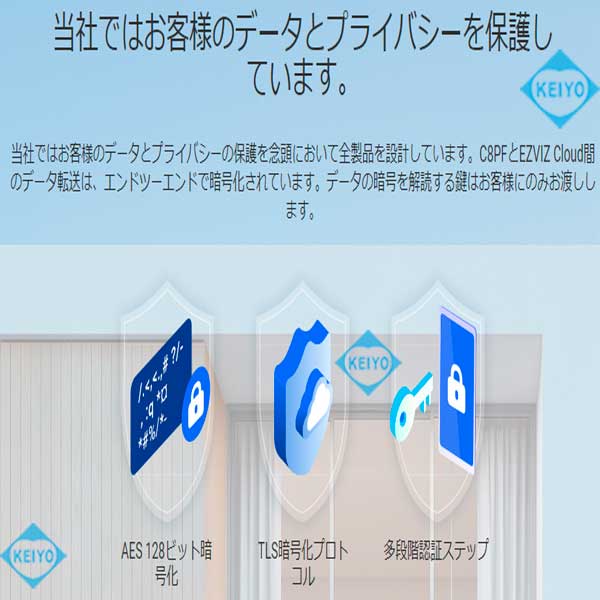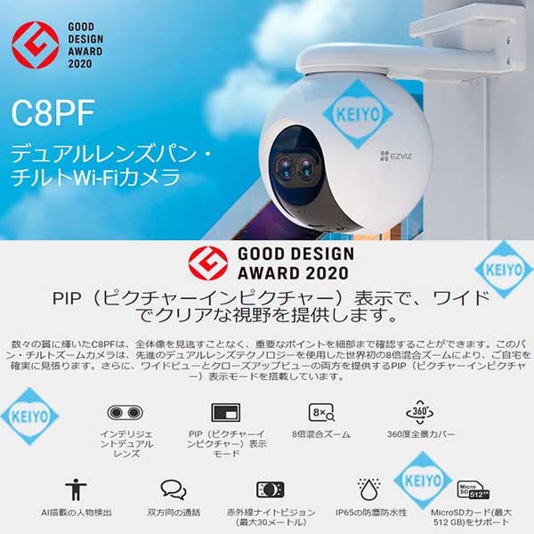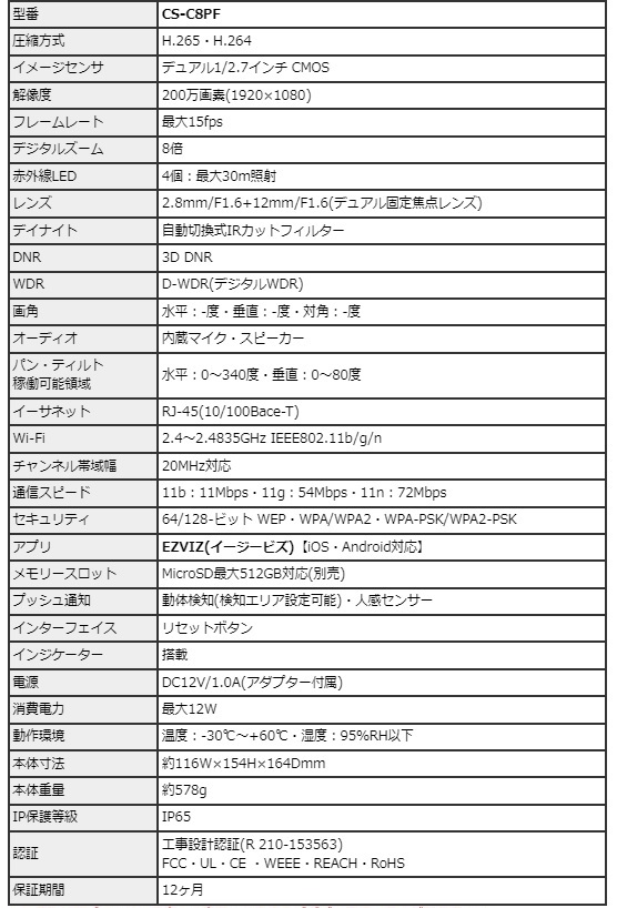![]() CS-C8PFは、H.265方式を採用した屋外設置対応 マイク・スピーカー内蔵パン・ティルト 200万画素Wi-Fiネットワークカメラです。 世界第1位の防犯カメラメーカー Hikvision (ハイクビジョン)社グループのコンシューマ向けブランド EZVIZ(イージービズ)ブランドの製品となっております。 【※姉妹品に、H.265方式採用屋内用4.0MPモデル CS-TY1(4.0MP)・CS-C6Wもございます】 ●広角・望遠撮影に対応するデュアルレンズ採用モデル 搭載するレンズは、2.8mm広角固定焦点レンズと 12mm望遠固定焦点レンズ2つを搭載した デュアルレンズ仕様となっております。 2つのレンズを組み合わせて撮影することで、8倍の混合ズームに対応。 従来のデジタルズームに比べて、画質を損なうことなく 1台で広角から、ズームアップまで対応します。 【※姉妹品に、4.0mmレンズ搭載屋外カラー暗視対応 パン・ティルトモデル CS-C8Cもございます】 ●デュアルレンズによるPIP(ピクチャ・イン・ピクチャー)表示 CS-8PFは、ライブ表示モード・ビデオ再生モードの両モードで PIP(ピクチャー・イン・ピクチャー)表示ができるように 設計されています。カメラは、小型ウィンドウディスプレイに 望遠レンズ画像を表示します。 全画面表示で、望遠レンズ映像を4倍に拡大しても デジタル映像のように、ぼやけることがありません。 遠くの対象物も見逃さないよう、気になるエリアは いつでもタップでズームイン/アウトすることができます。 ●屋外設置を可能にしたIP65構造 CS-C8PFは、屋内設置はもちろんのこと屋外設置にも対応。 ご自宅の駐車場監視、自宅敷地内へ立ち入る人の録画等にも ご活用いただけます。 耐候性設計ながら、約510gの軽量構造となっております。 また、スタイリッシュなデザインは2020年のグッドデザイン賞を 受賞しており、モダンな建物にも違和感なく調和します。 ●カメラを任意の方向へ向けて撮影できるパン・チルト機能搭載 本製品は、カメラを撮影したい方向に動かすことができる パン・チルト機能も搭載しております。 撮影対象をみたい方向にカメラを向けられますので 1台でより広い範囲をカバー可能。 稼働領域は、水平340度・垂直80度の範囲で稼働させることができます。 ●天井・壁面の両方に対応した取付ブラケット CS-C8PFに装着されているブラケットは、天井・壁面 2つの取付方法に対応します。 設置する環境に合わせて、お好みの撮影アングルになる方へ 取付てご利用いただけます。 ●双方向通話に対応するマイク・スピーカー内蔵モデル CS-C8PFは、本体前面に集音マイク、ブラケット部にスピーカーを 搭載しております。 ライブ映像確認時の音声マイクとしても、録画データ保存時にも 映像と音声を一緒に記録する事が可能です。 (※マイク機能は、オフにして利用する事も可能) スピーカーも搭載しておりますので、家族と会話を行ったり 不審者に対して、警告を行う事もできます。 ●人物検出に特化したAIアルゴリズム搭載 CS-C8PFは、動いた物体が人間の形状と動きをしているかを 自動で検出するAIアルゴリズムを搭載しています。 検知エリア内に人が侵入すると検出を行い、アラートできます。 ●フルハイビジョンサイズ動画・静止画撮影対応 動画・静止画共に1920×1080(1080p)の録画・撮影が可能。 動画撮影時は、音声記録にも対応します。 ●MicroSD512GB対応 動画・静止画は本体のMicroSDカードに記録ができます。(別売) SDカード内に記録された動画・静止画データは、スマホで接続して アプリ側に保存することも可能です。 ●クラウドストレージ対応(有料) メモリーカード録画以外に、有料のクラウドストレージを使用した 録画にも対応しております。(EZVIZクラウド) ご希望の方は、アプリ内のクラウドストレージ ご契約画面より、ご希望のプランをお選びいただきご契約ください。 ●わかりやすい日本語化アプリ 使用するアプリ、【EZVIZ(イージービズ)】は 日本語化されており、わかりやすいデザインです。 はじめての方にも、やさしい画面となっております。 ●赤外線LED4個搭載 最大照射距離30Mに対応した、可視光タイプ赤外線LED4個搭載。 明るい時はカラー映像、暗くなったらLED光を照射して 高感度モノクロ映像で撮影します。 ●見やすいインジケーターランプ搭載 本体前面に、各種動作が確認できるインジケーターを搭載しています。 ●動きがあった時だけ録画する、動体検知機能 カメラが動きを検知すると、スマホにプッシュ通知します。 (オン/オフ設定可) 画面上に動きの無いときは録画を行わないため、メモリの節約ができる他 反応があった際は、アプリのアラート画面から異変のあった時点の 動画を、ピンポイントで再生できます。 ●複数台のスマホからライブ映像を見る、シェア機能 カメラ設定を行ったスマートフォンから、別のスマホからライブ映像に 接続する事を許可(シェア)する事ができます。 ●ライブ映像・録画データアクセス時用パスワード設定対応 EZVIZシリーズのカメラは、ライブ映