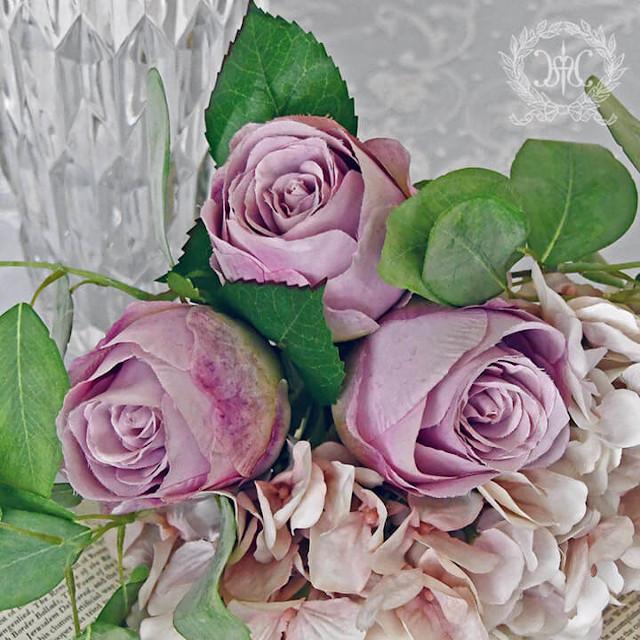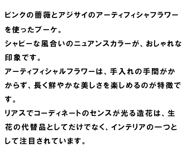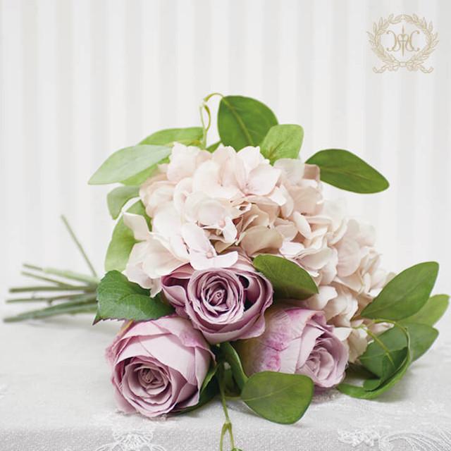 ピンクの薔薇とアジサイのアーティフィシャフラワーを使ったブーケ。 |