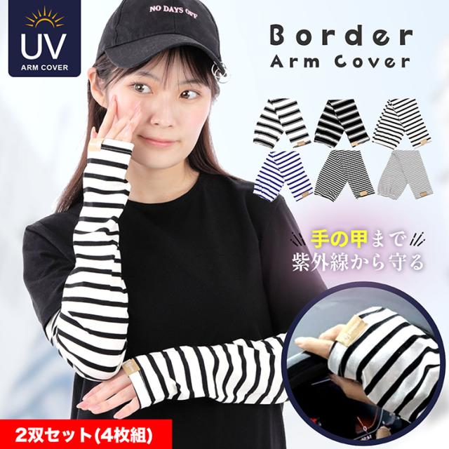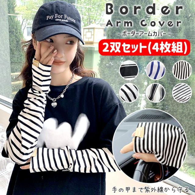 アームカバー レディース 2双セット(4枚組) UV 可愛い おしゃれ ボーダーアームカバー 幅広 ボーダー メンズ UVカット 日よけ防止 紫外線対策 指なし 冷え対策 スポーツ アウトドア 男女兼用 ブラック ホワイト ブルー
