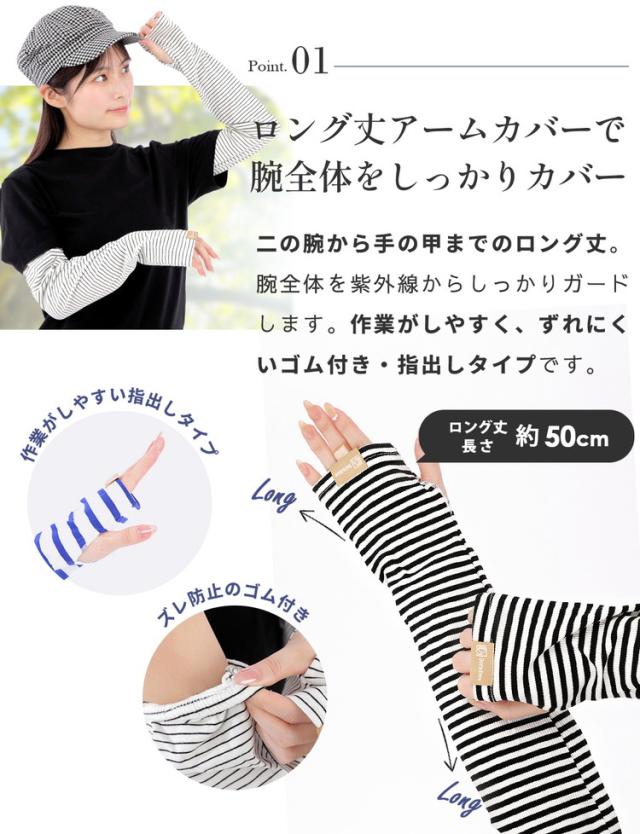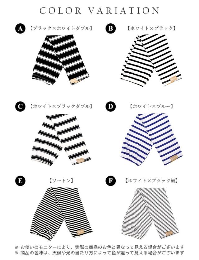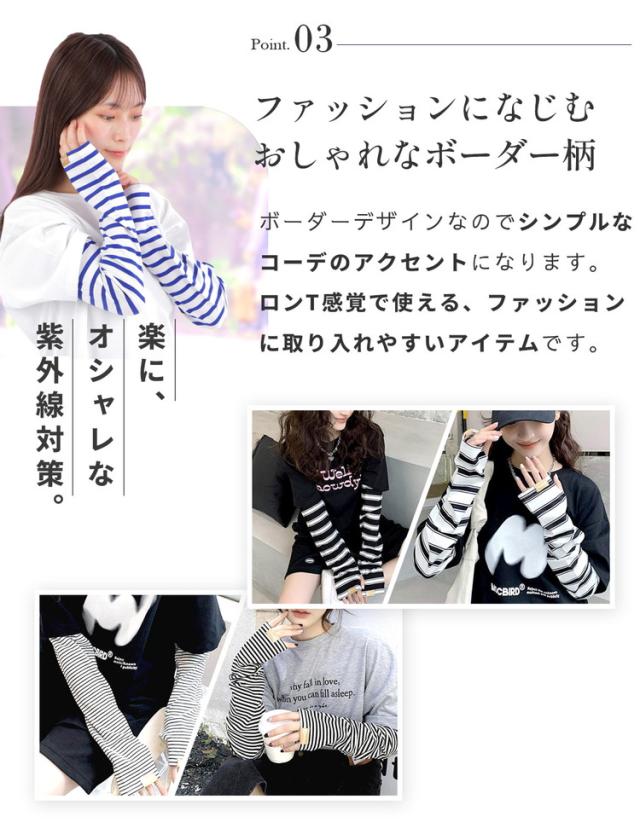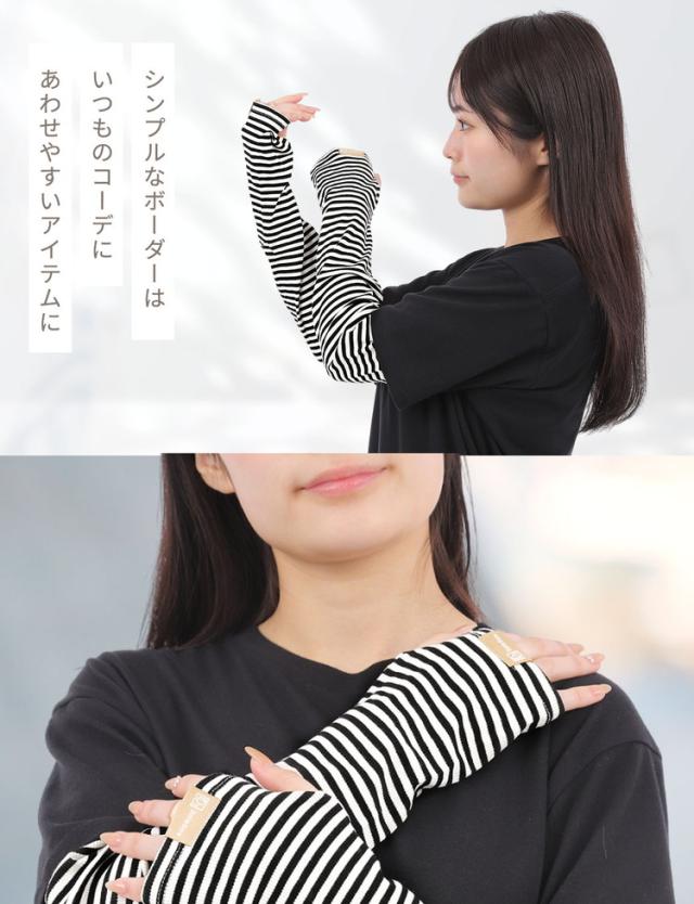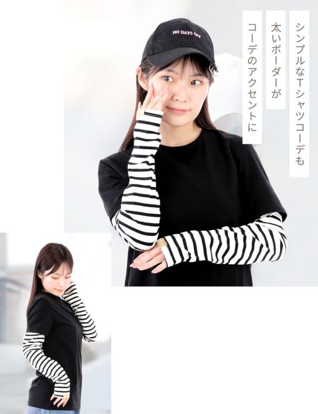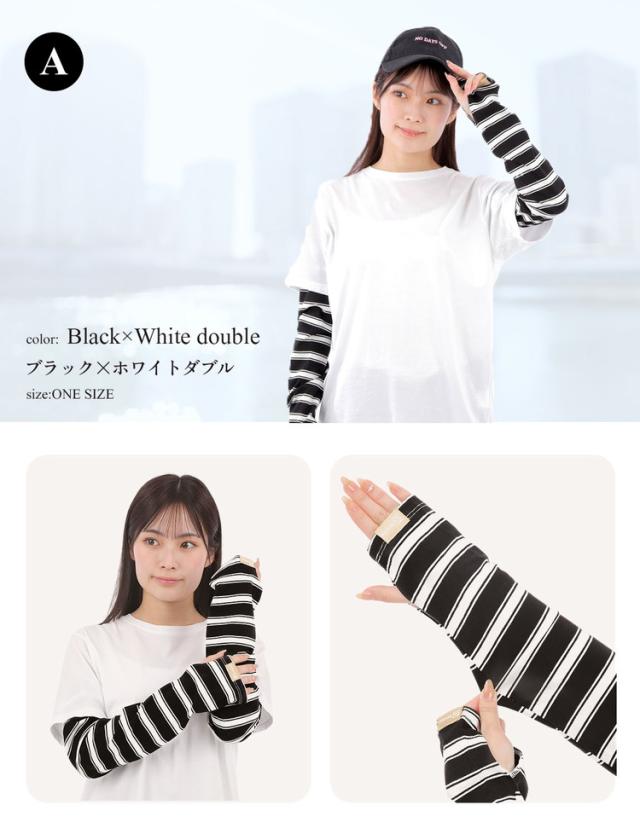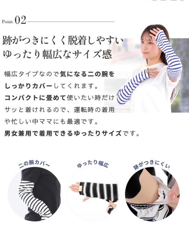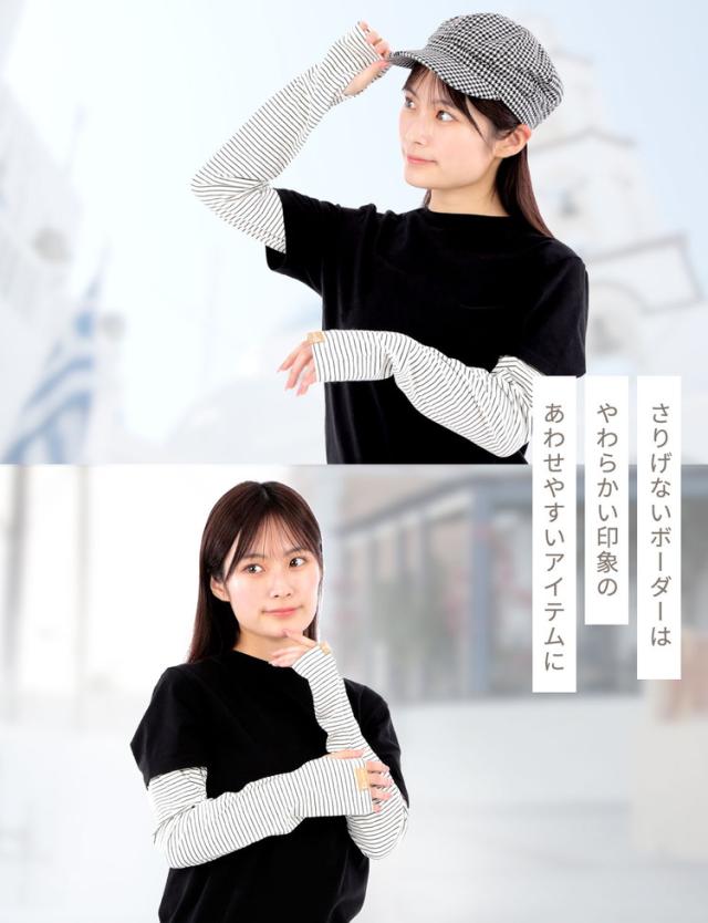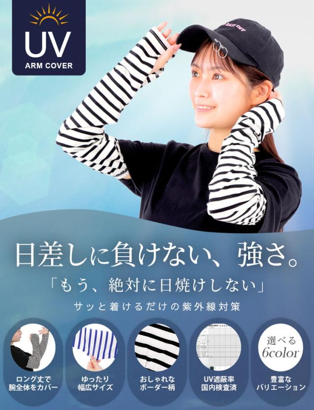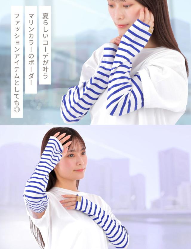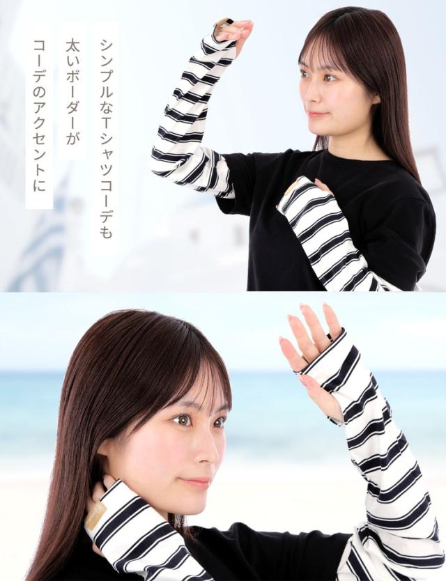 腕全体を紫外線からしっかりガードする幅広タイプのボーダーアームカバーです