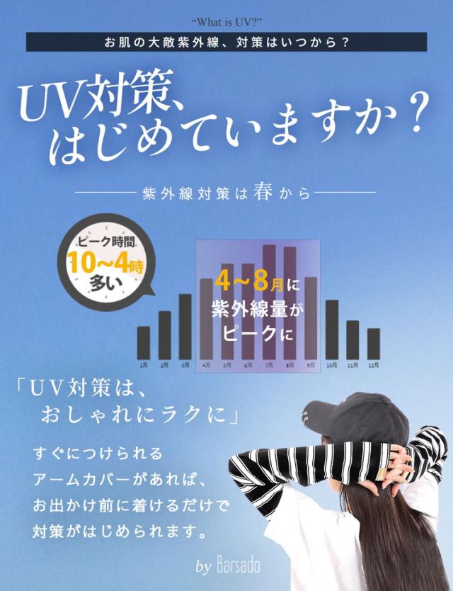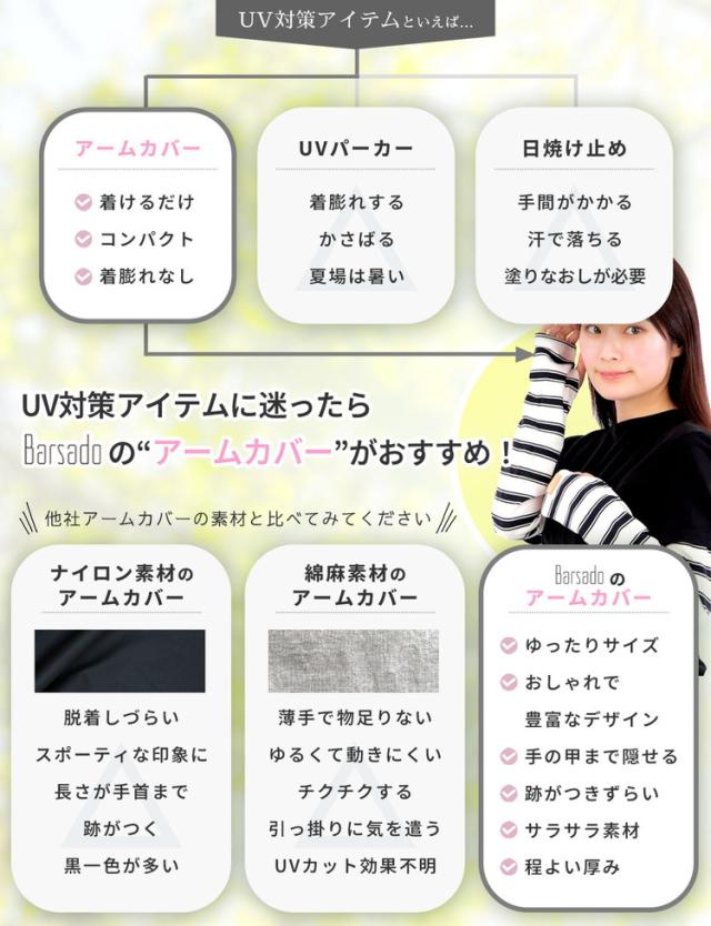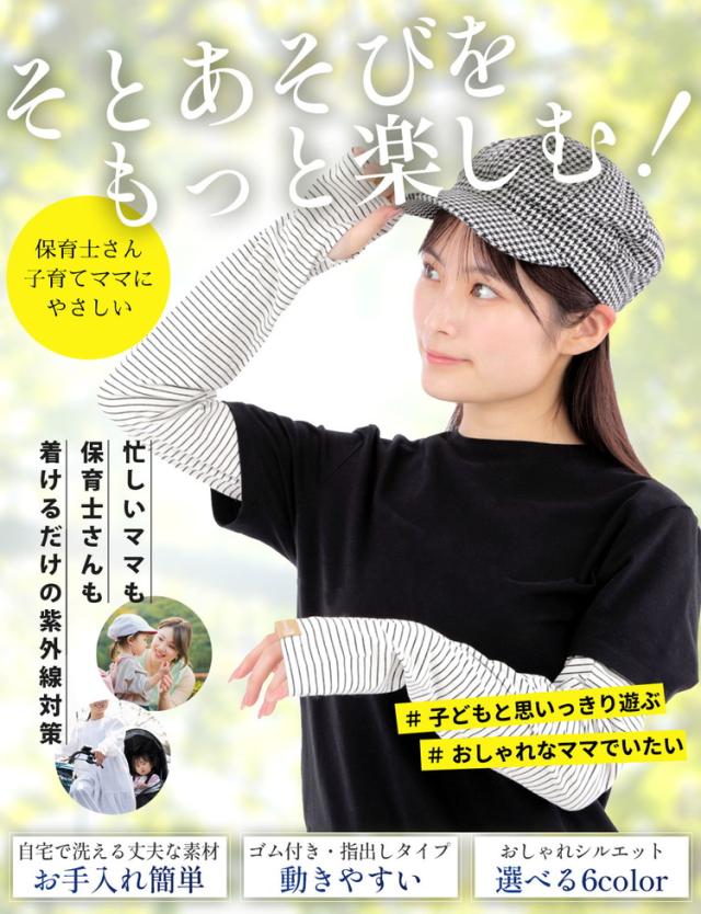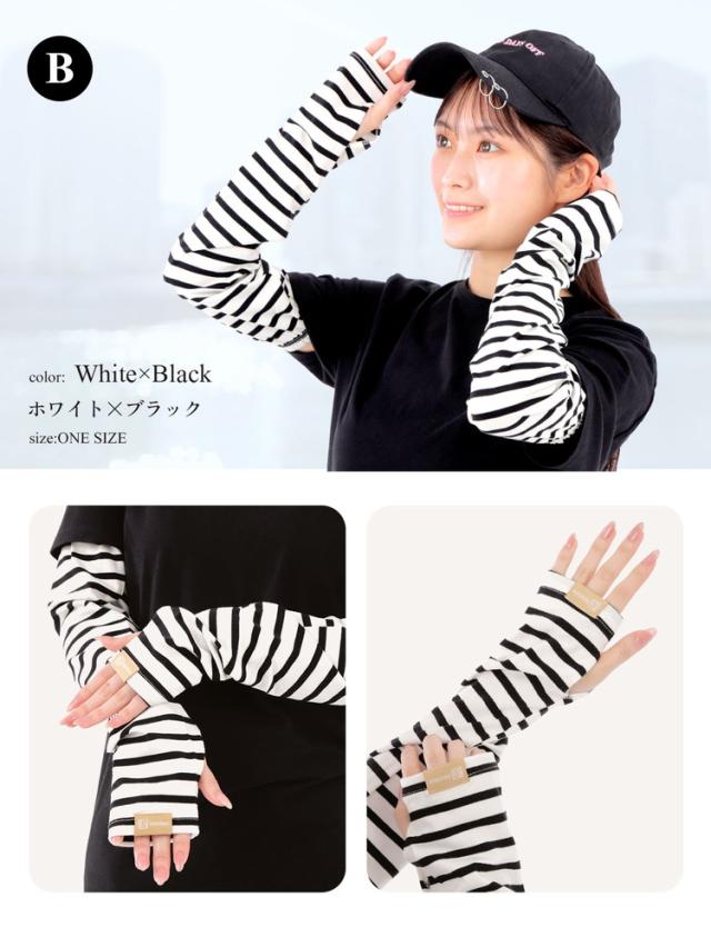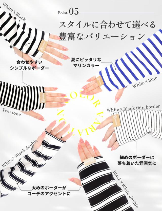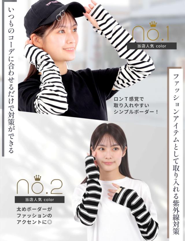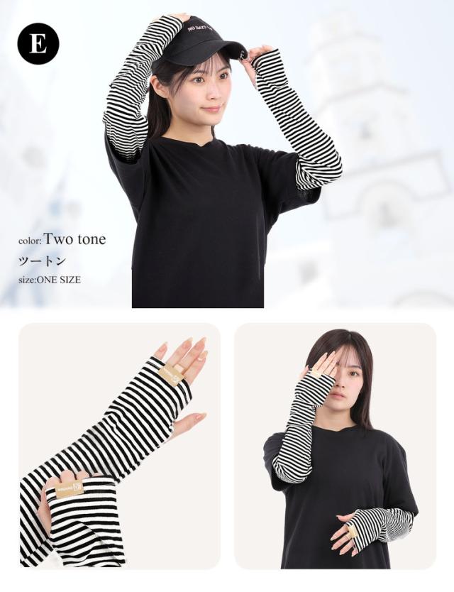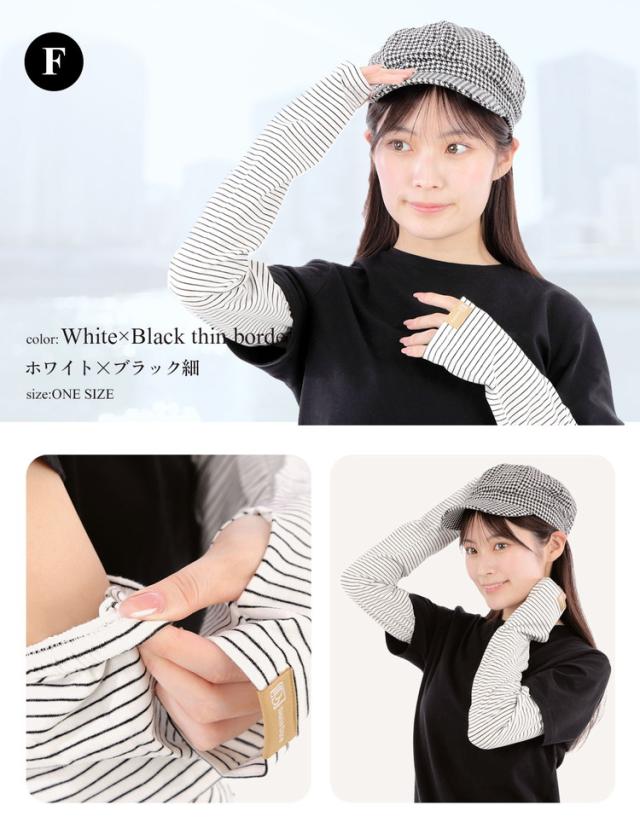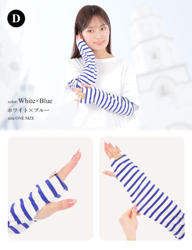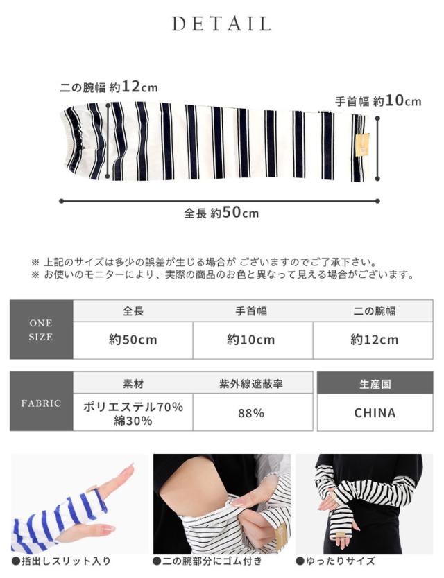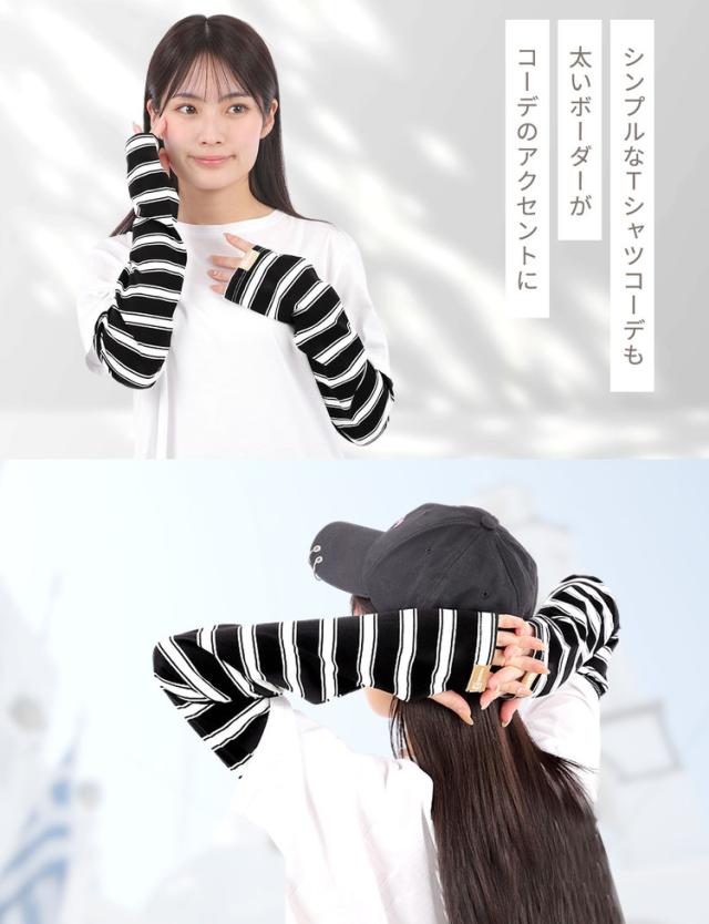 腕全体を紫外線からしっかりガードする幅広タイプのボーダーアームカバーです