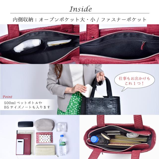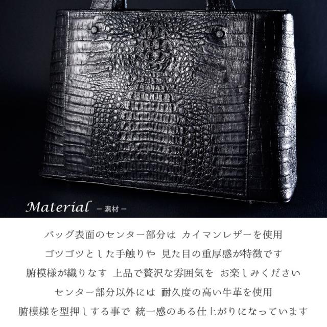 | 特徴 | 仕事もお出かけもこれ1つできまり。 持ち手は、肩が通り、丁度良い長さ。 バッグ表面のセンター部分はカイマンレザーを使用。 ゴツゴツとした手触りや、見た目の重厚感が特徴です。 腑模様が織りなす、上品で贅沢な雰囲気をお楽しみください。 センター部分以外には、耐久度の高い牛革を使用。 腑模様を型押しする事で 統一感のある仕上がりになっています。 あおりポケットは、A5サイズのノートが入る十分な大きさです。 背面には小物をさっと取り出せるファスナーポケット付きで、 メイン収納には、500mlペットボトルや、B5サイズノートも入ります。 その他の拘りポイント ・引手にも革を使用し統一感があります ・ファスナーは信頼のYKK製で滑らか開閉 ・ハンドルの金具が目立たない仕様です ・底鋲で汚れを防止 |