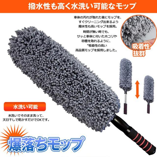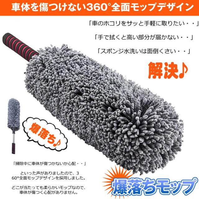 デザイン:360度モップがついているので車に傷が付きにくい!グリップ部分は持ちやすく、モップをしっかり支える頑丈なステンレススチールを採用