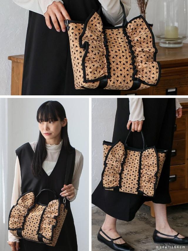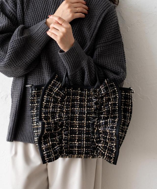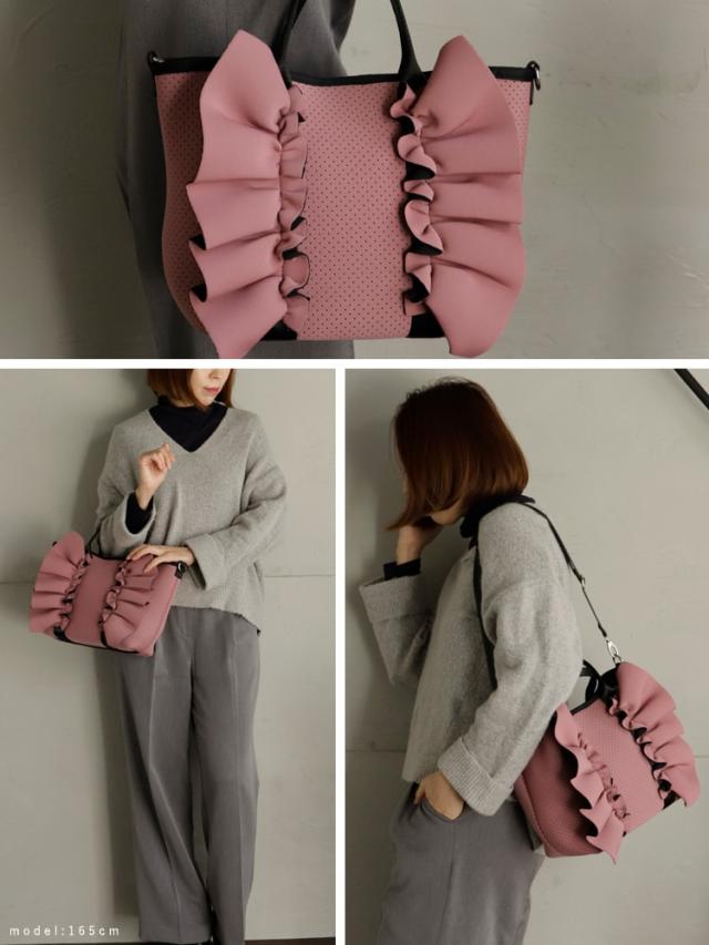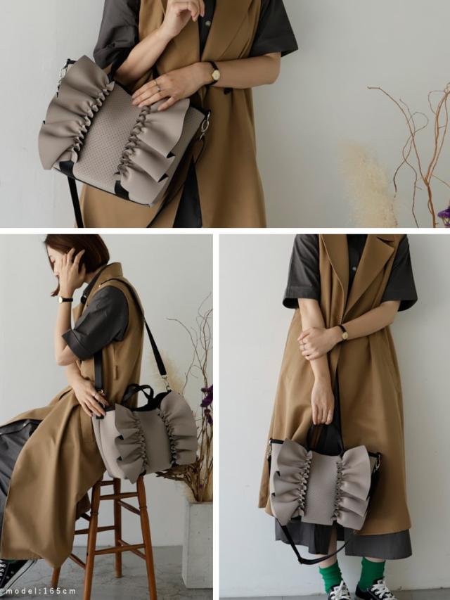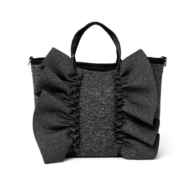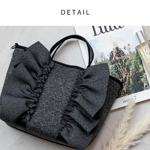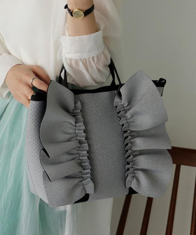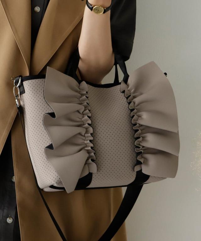 大きなフリルデザインが印象的なトートバッグ。