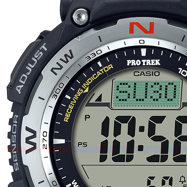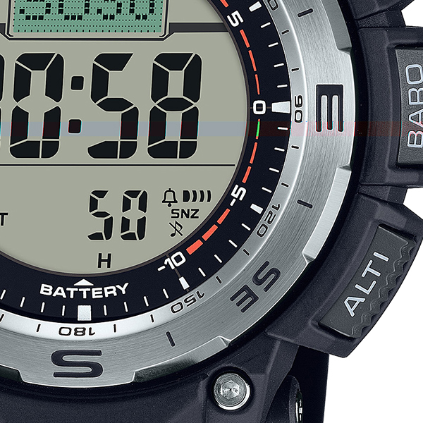 時計液晶部には、デュプレックスLCDを採用しました。方位表示部と時計機能表示部の液晶を別にしたデュプレックスLCDにより、コンパス表示を大型化し、判読性を高め、より方角が分かりやすい機能美あるデザインで表現しています。更に簡易方位メモリーに役立つ回転ベゼルを採用しています。また、圧力センサーをケースの内側に搭載することで、ケースの凹凸を減らしボタンが操作しやすい形状となっています。機能感あるデザインによりアウトドアギアらしい表情を醸し出します。時計本来の機能として世界6局の電波を受信するマルチバンド6やタフソーラーなど実用的な機能も兼ね備えます。