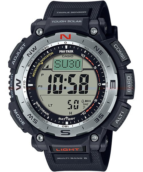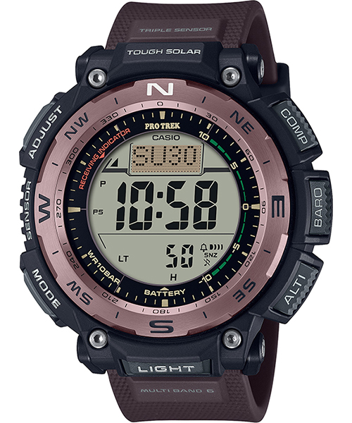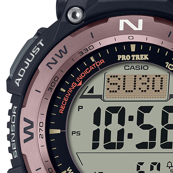 時計液晶部には、デュプレックスLCDを採用しました。方位表示部と時計機能表示部の液晶を別にしたデュプレックスLCDにより、コンパス表示を大型化し、判読性を高め、より方角が分かりやすい機能美あるデザインで表現しています。更に簡易方位メモリーに役立つ回転ベゼルを採用しています。また、圧力センサーをケースの内側に搭載することで、ケースの凹凸を減らしボタンが操作しやすい形状となっています。機能感あるデザインによりアウトドアギアらしい表情を醸し出します。時計本来の機能として世界6局の電波を受信するマルチバンド6やタフソーラーなど実用的な機能も兼ね備えます。