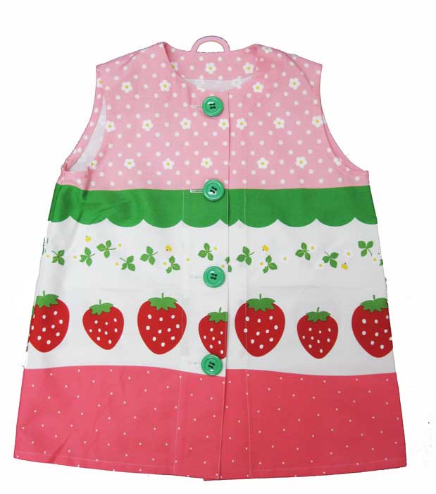スモック 袖なし前開きスモック (ピンク×大きいいちご柄緑ボタン)綿100% 入園 入学 幼稚園 保育園 小学校 キッズスモック(詳細)