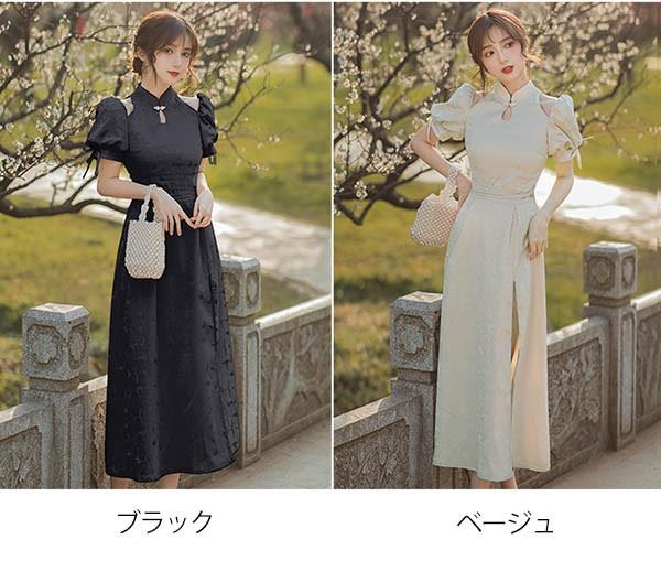 【送料無料】チャイナドレス スリット入り ミモレ丈ドレス 演奏会 大人 ピアノ 発表会 黒 ワンピース 袖付き 半袖 中国風 ステージドレス 二次会 花嫁 母親 パーティードレス ハワイ 結婚式 リゾートワンピ