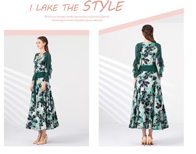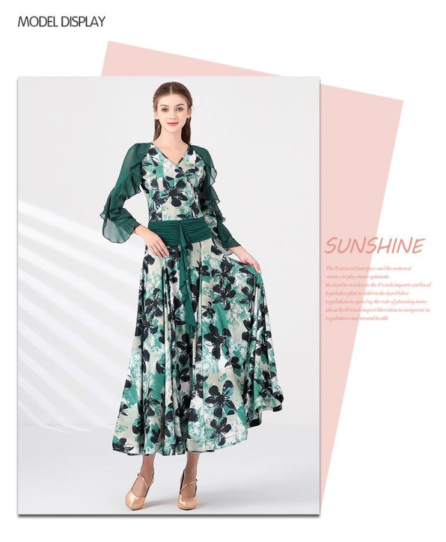 【送料無料】社交ダンスドレス ダンス衣装 社交ダンス ドレス 衣装 ダンスドレス Vネック ポワン袖 フリル フレア 長袖 袖あり 透け感 花柄 ミモレ丈 スタンダードドレス ワルツ モダン 競技ダンス ダンスウェア レッスンウェア イベント
