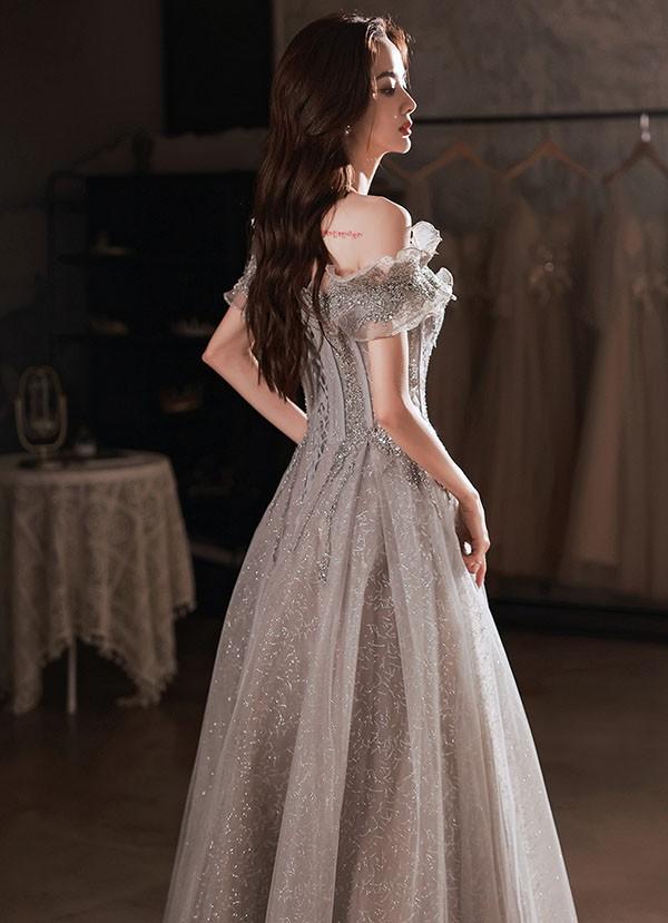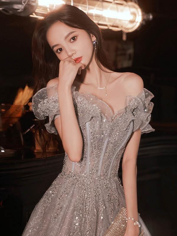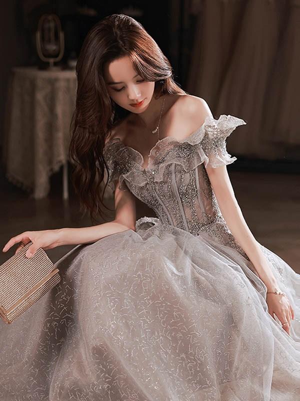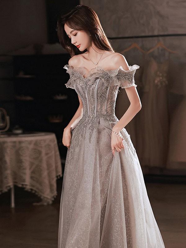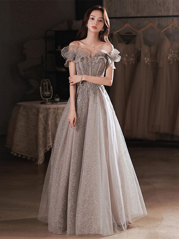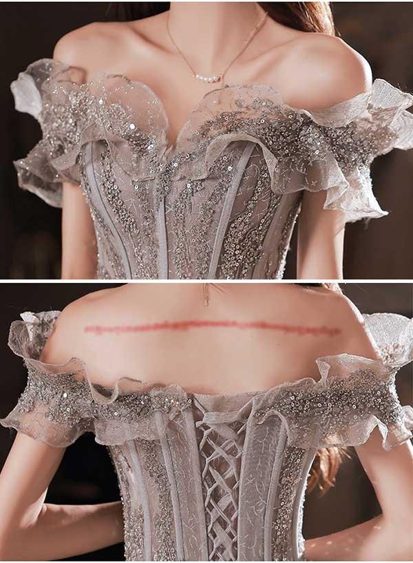 ロングドレス オフショルダー 演奏会 大人 ピアノ 発表会 ワンピース 袖付き キラキラ ドレス フリル 半袖 成人式 同窓会 演奏会ドレス Aライン 結婚式 ステージドレス 二次会 花嫁 母親 パーティードレス ウエディング ハワイ 結婚式 リゾートワンピ グレー XS S M L 2L 3L 4L da169n1n1l9