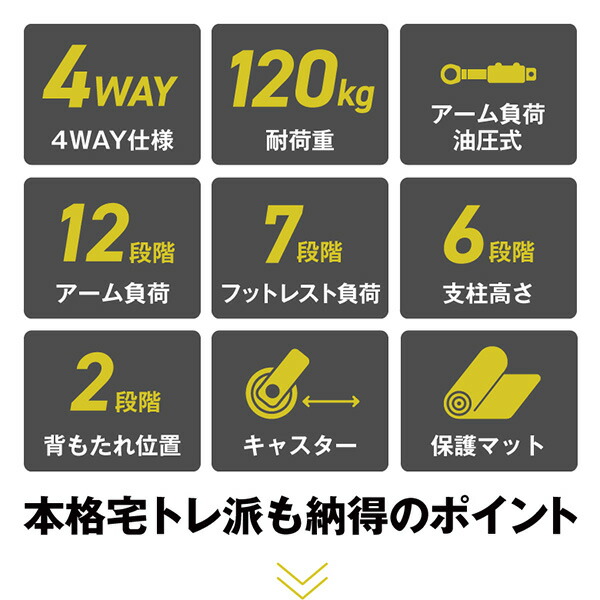 | 商品説明 | ●自分にあた負荷で無理せず運動できる ●安全に使える油圧調整式 ※アームの調節のみ ●左右別々に負荷調節可能 ※アームの調節のみ ●キャスター付きで移動もらくらく ●保護マット(60×150cm/厚み3mm)付属 |
