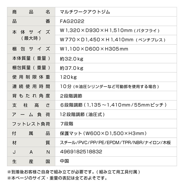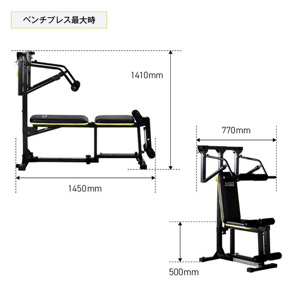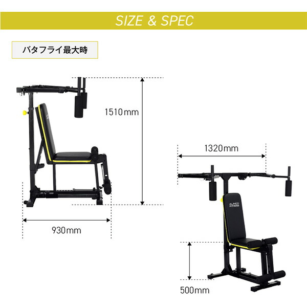 | 本体サイズ | (バタフライ)幅132×奥行93×高さ151cm (ベンチプレス)幅77×奥行145×高さ141cm 重量:約32.0kg |