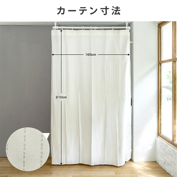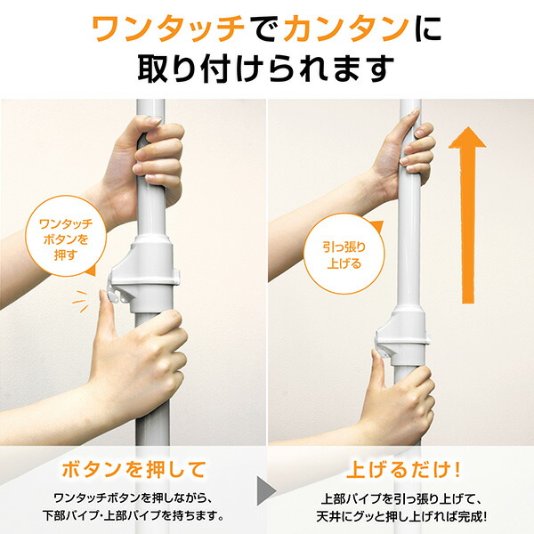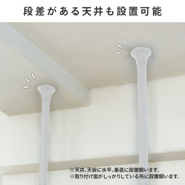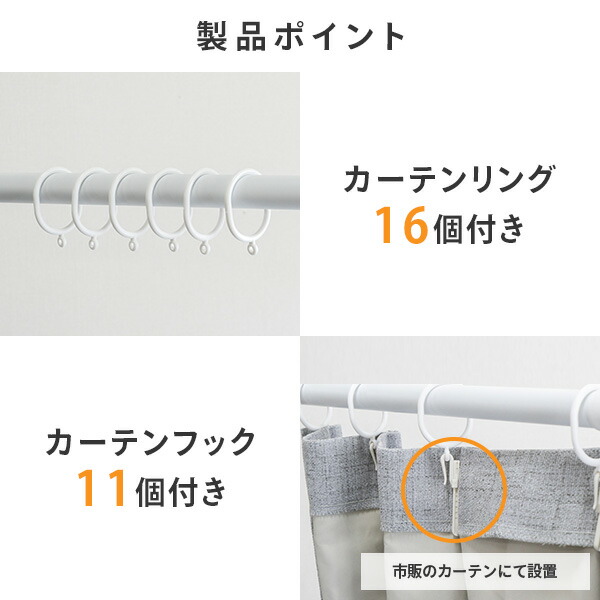 | 商品説明 | ●ワンタッチ固定装置で女性でも簡単取り付け ●スプリング圧縮式で安定性バツグン ●段差がある天井にも設置可能 ●全体耐荷重:ハンガーバー1本あたり約30kg カーテンパイプ2kg *均等荷重時 ●市販のカーテンを使用可能 ●カーテンフック11個付き ●カーテンリング16個付き ●ハンガー掛け降ろし棒付き |