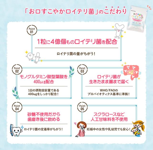 ロイテリ菌が生きたまま腸まで届くなどWHO/FAOのプロバイオティクス基準に準拠。