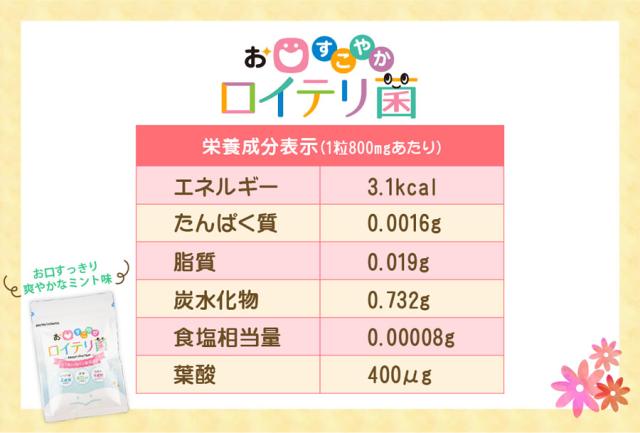 還元パラチノース(国内製造)、イソマルト、乳酸菌凍結乾燥末/トレハロース、セルロース、ステアリン酸カルシウム、微粒酸化ケイ素、香料、葉酸
