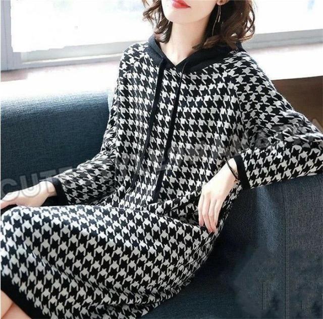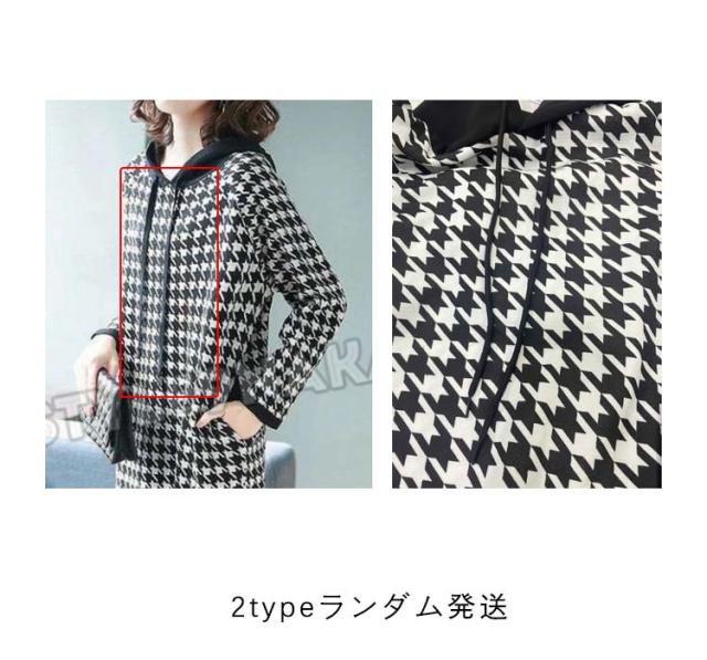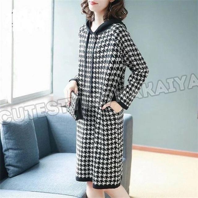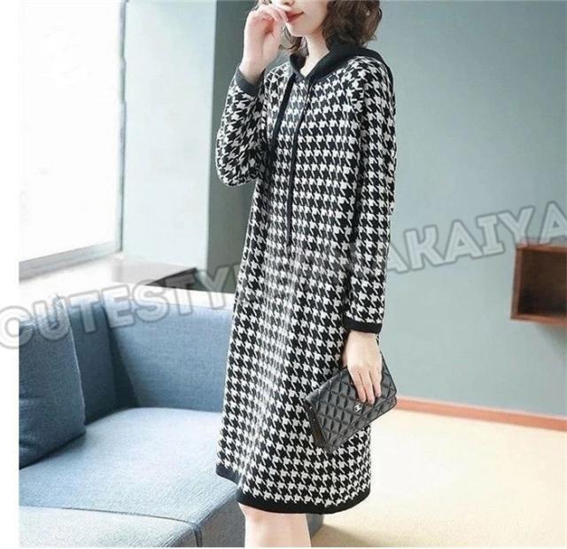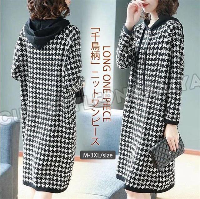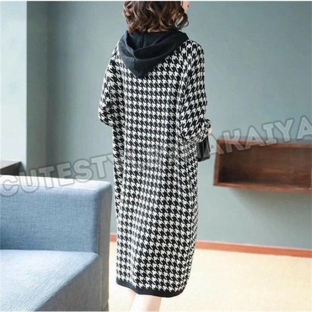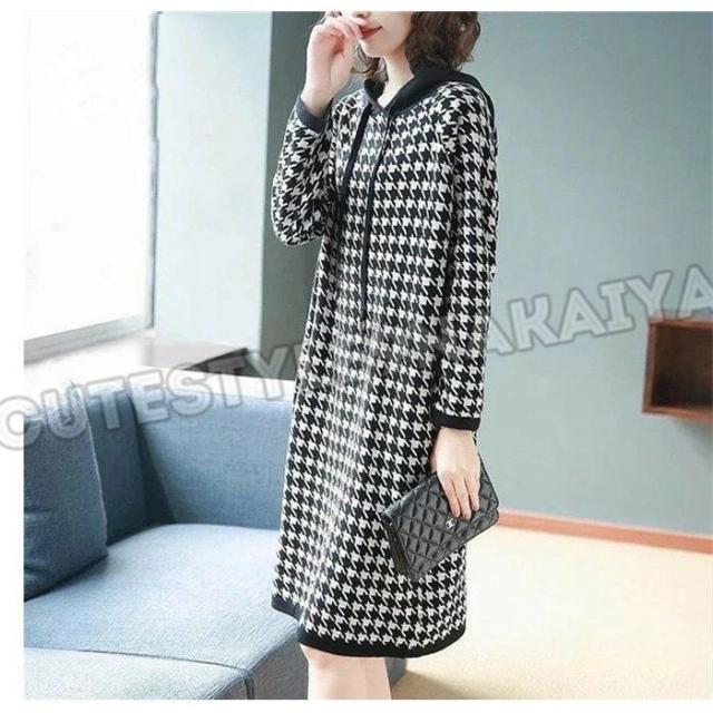ロングワンピース レディース ニットワンピース パーカーワンピース ワンピース 秋冬 体型カバー 千鳥柄 ロングパーカー ゆったり ロングニット 長袖 フード付