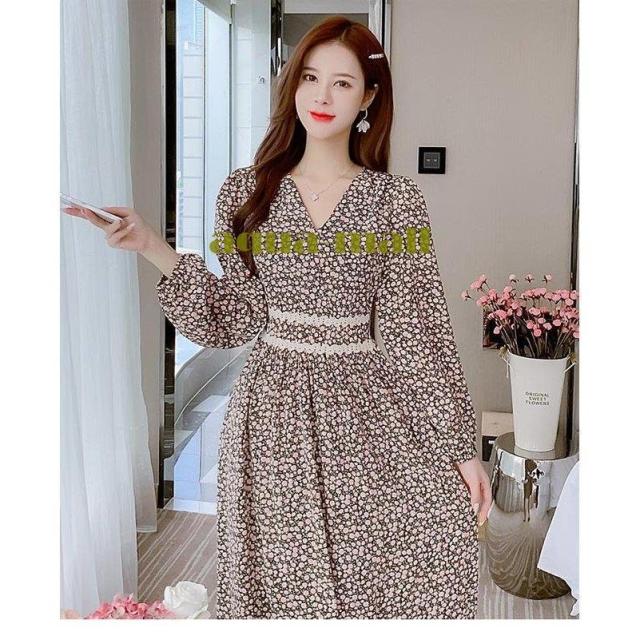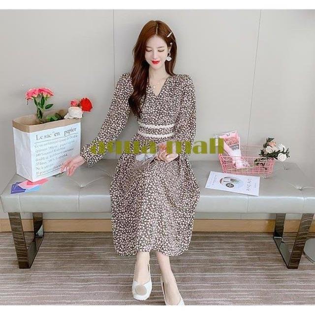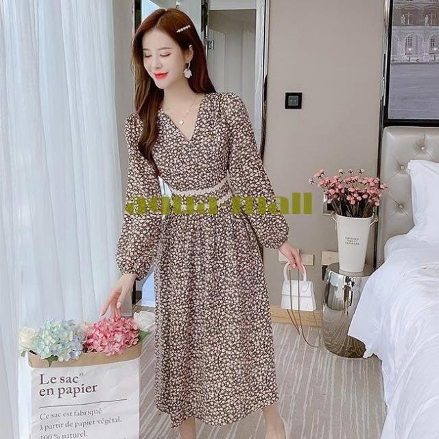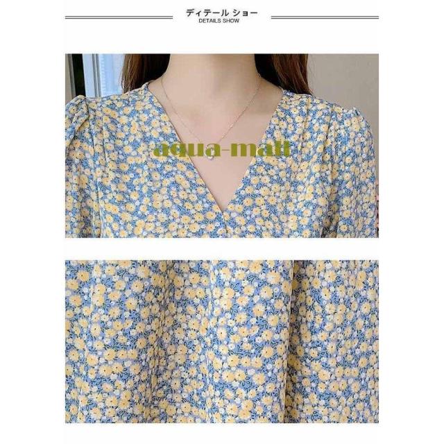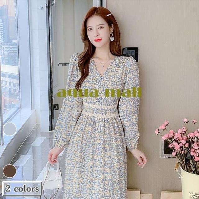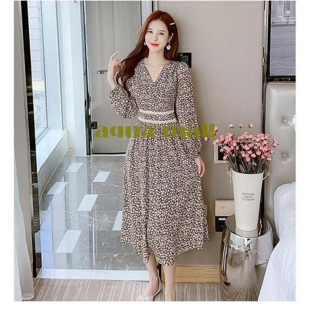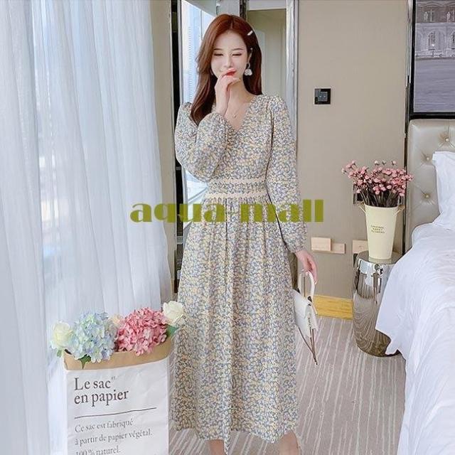 柄ワンピ 長袖 レディース ワンピース Vネック ロングワンピ 春 花柄ワンピース マキシ丈 ウエストゴム 春ワンピース 花柄 長袖ワンピース