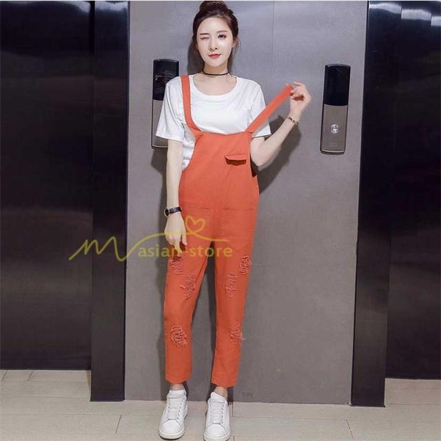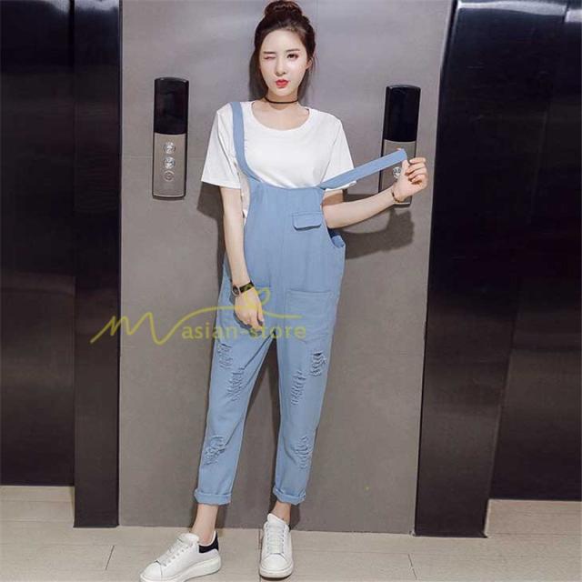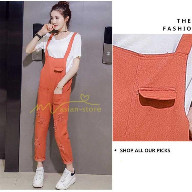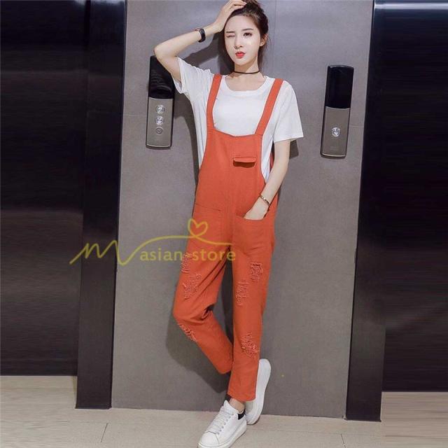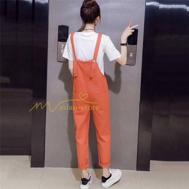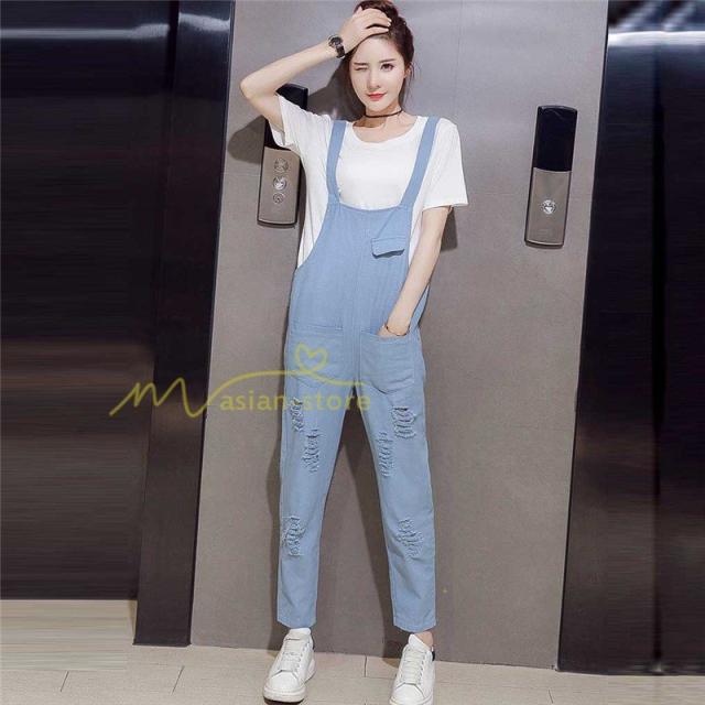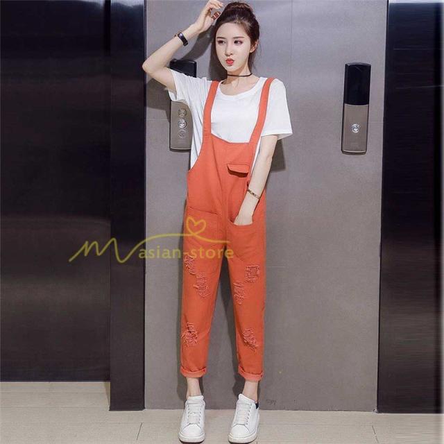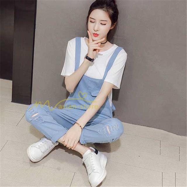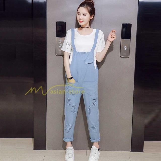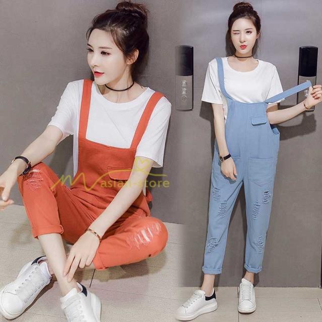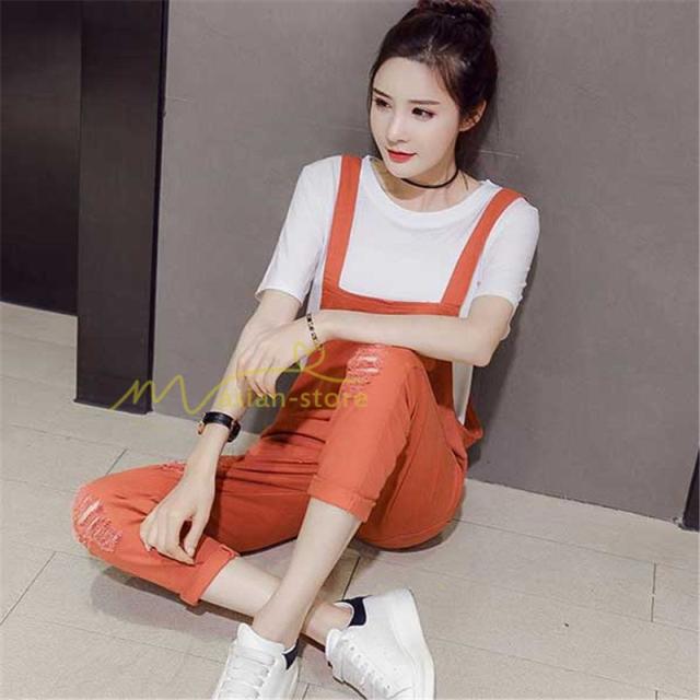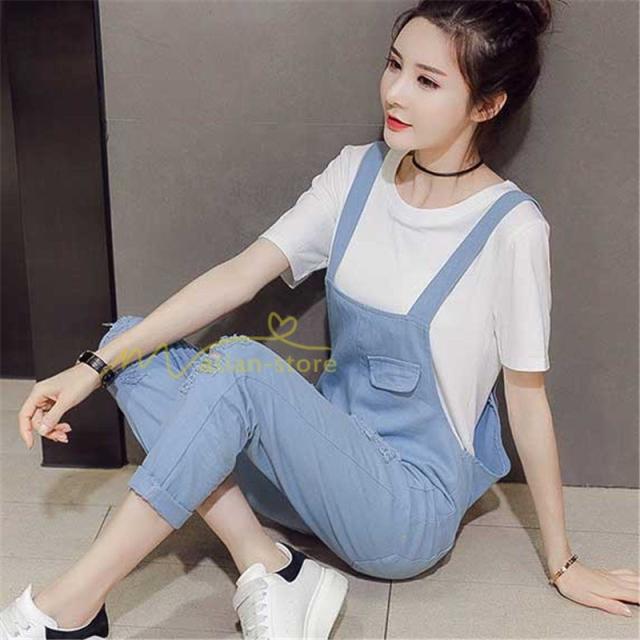 セットアップ デニム オーバーオール Tシャツ 無地Tシャツ デイリーコーデ 普通着 韓国風 気質 半袖 オシャレ 九分丈パンツ シースルー ダメージ加工 夏コーデ